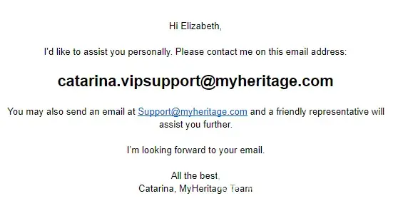 Please note that my email address is 'elena.vipsupport @ myheritage.com', without the spaces before and after the symbol '@'.
