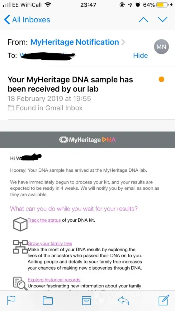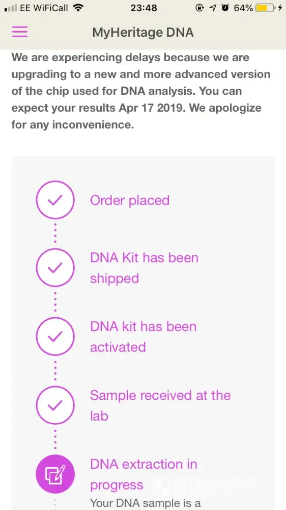 I sent my kit to the company more than two months ago and they received it on February 1st. The results were supposed to come out at the end of February and I've been eagerly checking my e-mail all this time for confirmation that they were ready. However, I've just been notified by My Heritage that my results will be delayed by a month. In their e-mail, they mention that this is due to upgrading to a new and more advanced version of the chip used for DNA analysis. Apart from the vagueness of this explanation, I feel this was an entirely predictable delay and and I should have been notified earlier on that it would take 2 months for them to process my sample from the moment they received it. When I bought the kit, their website mentioned that it takes 4 weeks with no mention whatsoever of planned delays. If I knew it would take that long, I would have bought a kit from another company. My account ID is [protected] and kit MH-74A76F.