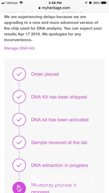 I emailed My Heritages support team and was contacted the same day. The representative who I contacted was extremely helpful and very understanding of my frustration. She let me know that I could contact her directly with any issues and if I don't receive results by given date, she will escalate it for me. Her professionalism and quick reply made me feel much better. I am pleased with the outcome.