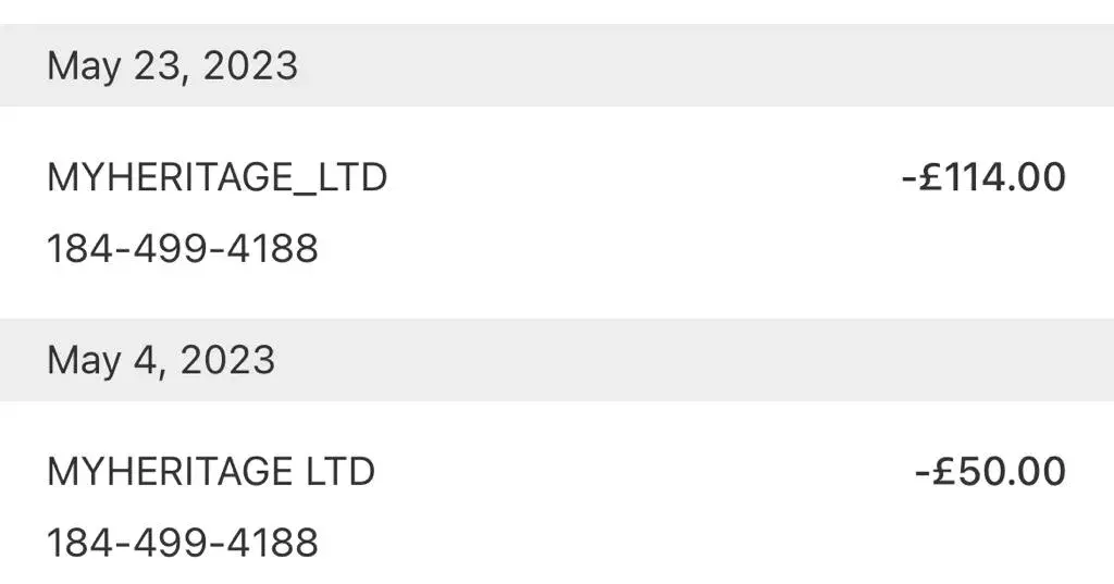 I signed up for a free subscription and purchased a DNA kit through my account. However, after one month, I noticed a charge of 114 GBP on my bank account. I did not make any purchases or subscriptions on that day, leading me to believe that MyHeritage took money from my account without my permission.