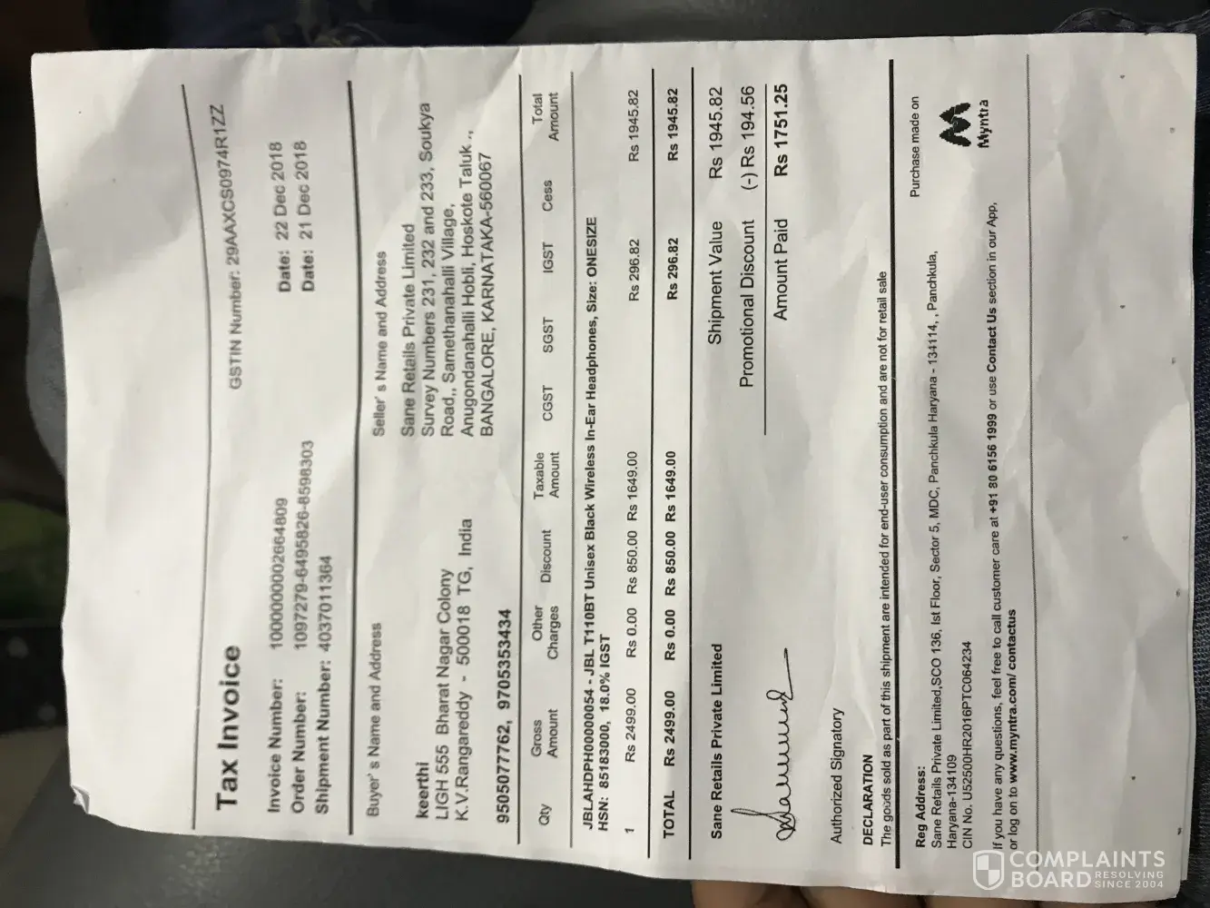 I ordered jbl earphones rom myntra.com and received empty jbl box without earphones in it. Called courier boy and registered complaint through myntra customer service. I have read many complaints of this sort on forums and they simply say we did quailty check and dont care about customers. How can something like this happen if you deliver it right. I want refund of keeping otherways ready to get it. Order number-[protected]-8598303. Complaint number-IN18122412271467544368.