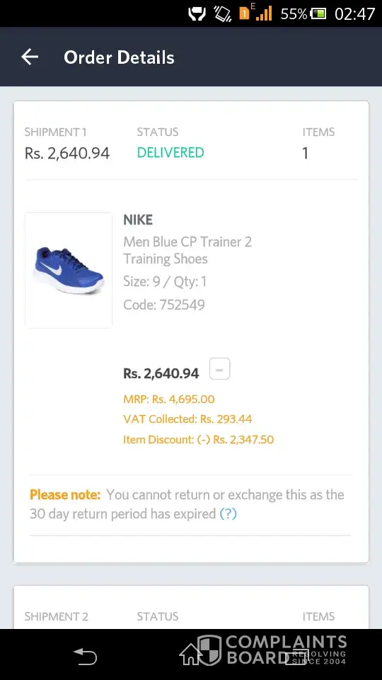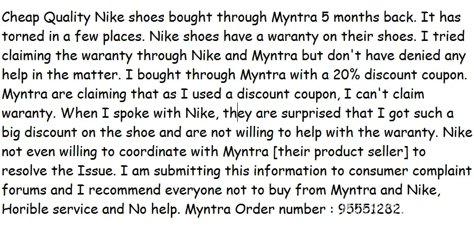 Cheap Quality Nike shoes bought through Myntra 5 months back. It has torned in a few places. Nike shoes have a waranty on their shoes. I tried claiming the waranty through Nike and Myntra but don't have denied any help in the matter. I bought through Myntra with a 20% discount coupon. Myntra are claiming that as I used a discount coupon, I can't claim waranty. When I spoke with Nike, they are surprised that I got such a big discount on the shoe and are not willing to help with the waranty. Nike not even willing to coordinate with Myntra [their product seller] to resolve the Issue. I am submitting this information to consumer complaint forums and I recommend everyone not to buy from Myntra and Nike, Horible service and No help. Myntra Order number : [protected].