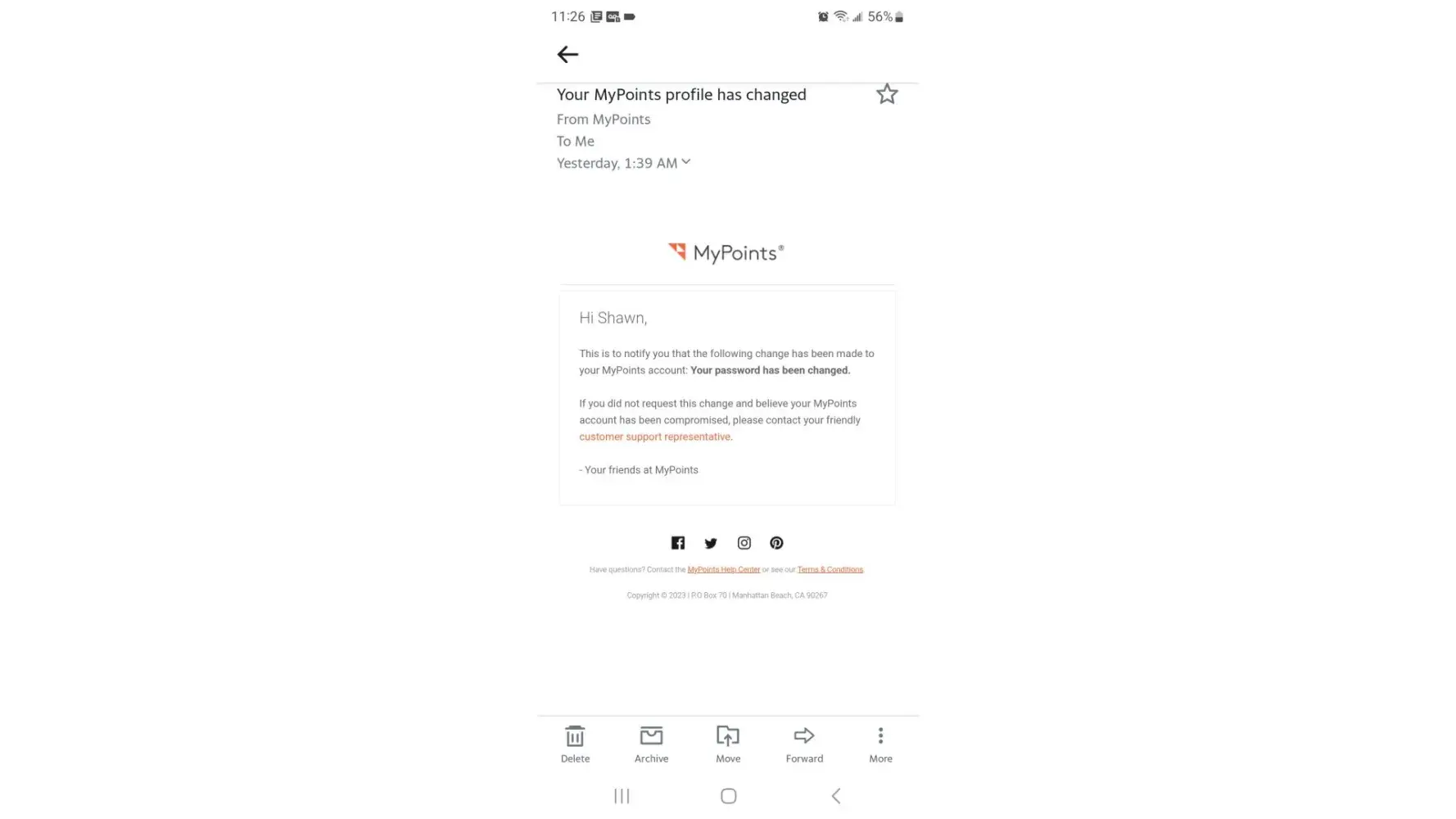 My Account was hacked on 1/31/23 and they used points for a $100 and $10 PayPal gift cards. I tried to reset my password but when I press the forgot password link it does not email me to reset. So i'm assuming whoever hacked my account possibly changed my email address!