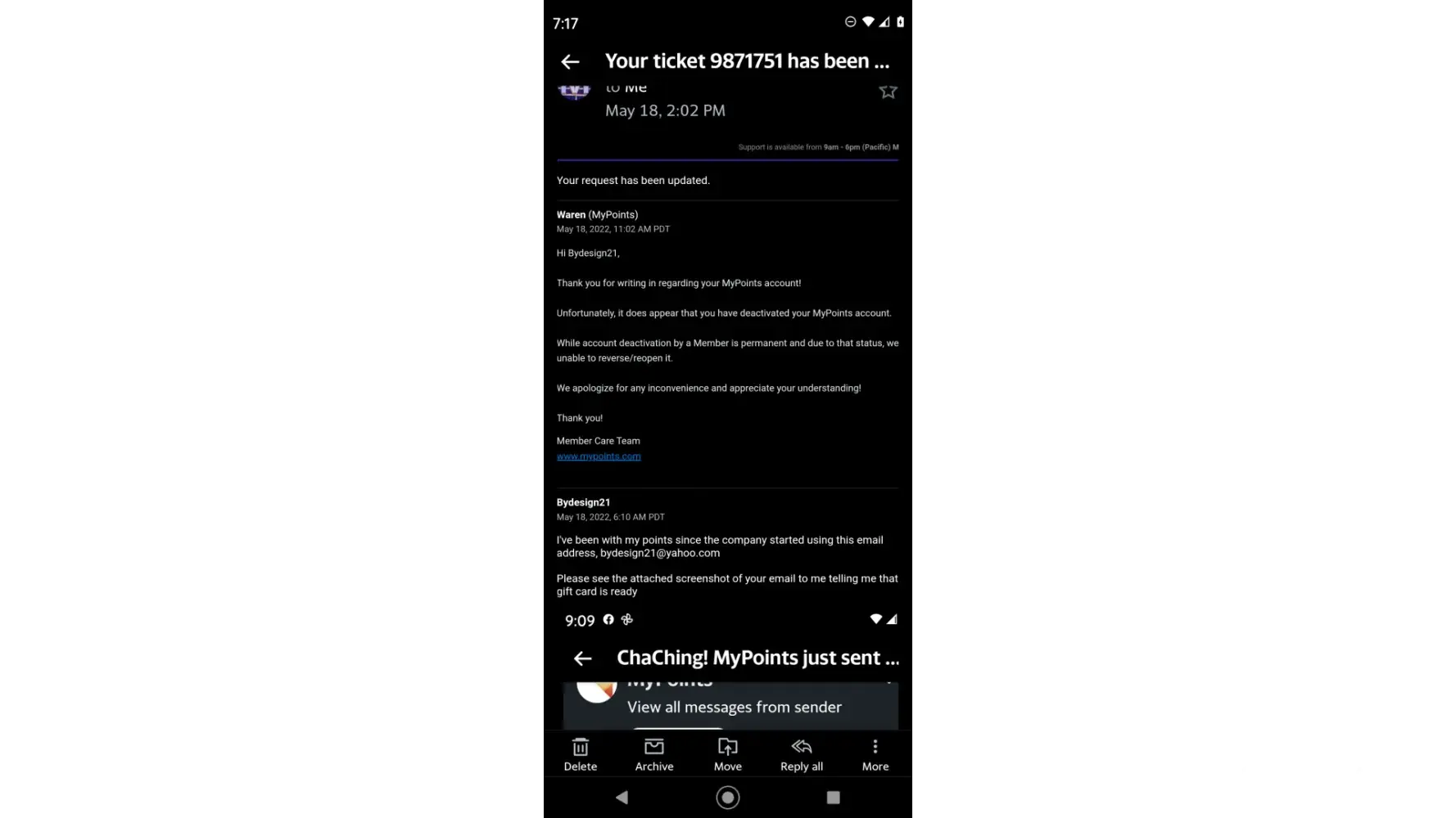 On December 17 I purchased 2 gift cards with no problems. I attempted to purchase a third and was told I reached my limit for the day. On December 18 I did the daily poll and viewed the deal of the day. I then started to purchase another gift card. I was requested to log in again and received a message that my account was deactivated. I tried to contact customer service but couldn't do it through mypoints since I didn't have access. On the mypoints website I was given the option to submit my issue by using a form. I submitted the form and received an email back from customer support that I needed to submit my request in mypoints. Feels like I have been scammed.