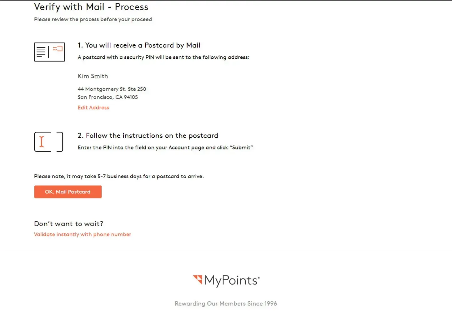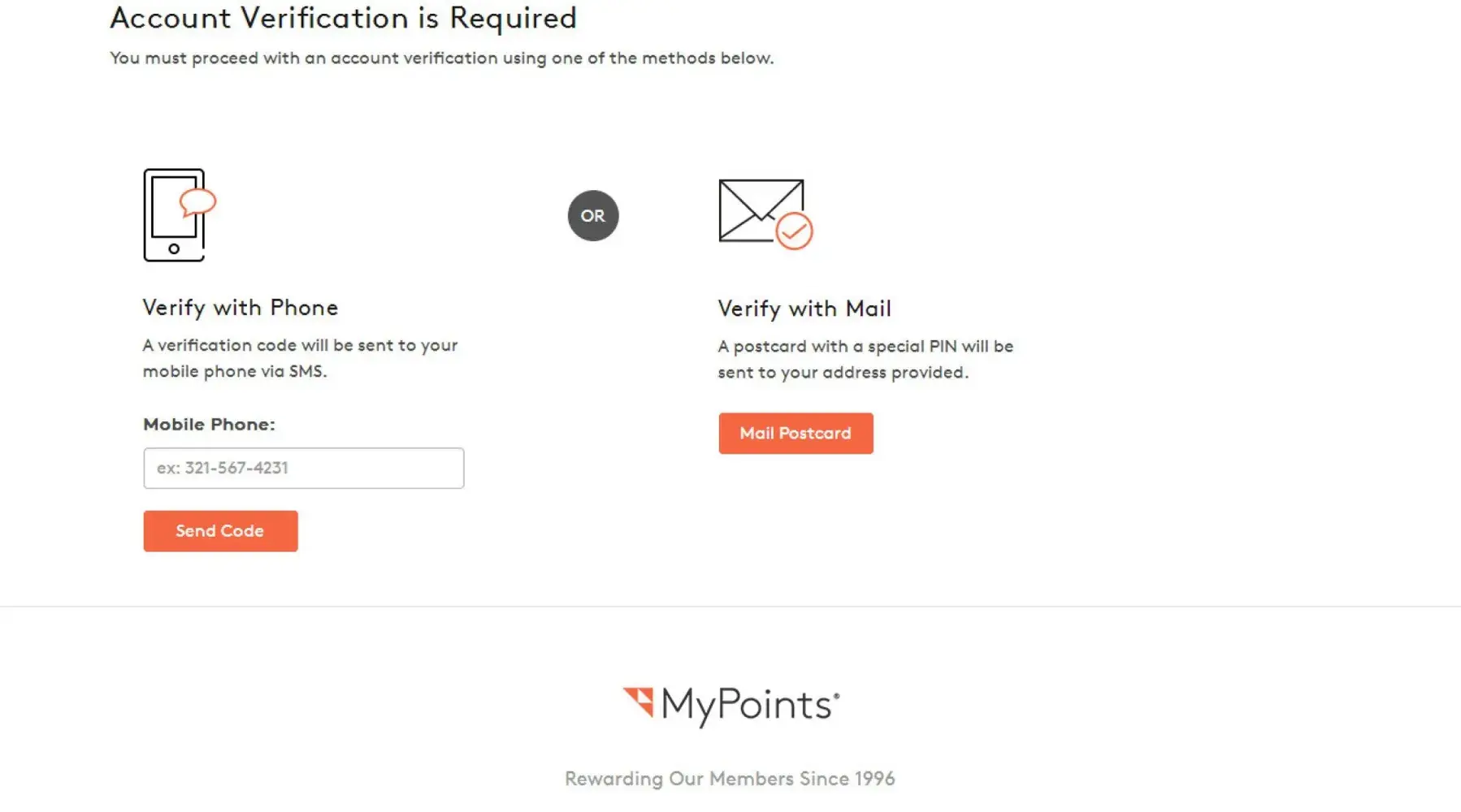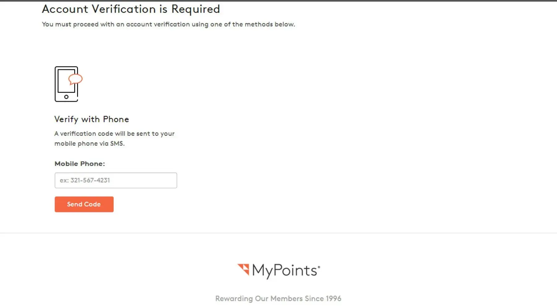 Other people online have reported problems when submitting their cell phone number. Some have received no code, some receive a code weeks later, and some receive a code that doesn't even work. Is MyPoints harvesting cell phone number? Are they closing down? Are they trying to avoid paying users for their services? I don't know but I find this behavior very suspicious and shady. I filed a complaint with the FTC and other applicable agencies because this is not right. Note that MyPoints is owned by Prodege, which have their offices in El Segundo, CA, phone 310-294-9599. I called them but the phone number is just an automated response.