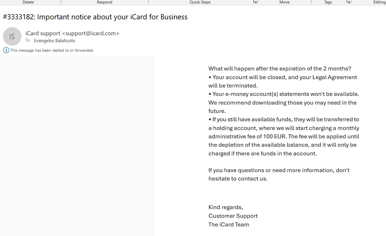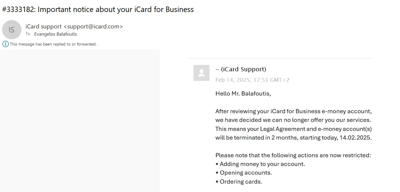 After reviewing your iCard for Business e-money account, we have decided we can no longer offer you our services. This means your Legal Agreement and e-money account(s) will be terminated in 2 months, starting today, 14.02.2025.