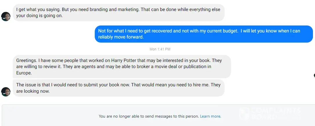 Despite this, Myron pushed for me to actively get into business with him immediately (See “Myron Grace 3.pngâ€). I insisted on my decision and he returned later with some story about getting people who worked on Harry Potter possibly being interested in my book. (See “Myron Grace 4.pngâ€) I promptly blocked Myron from social media.