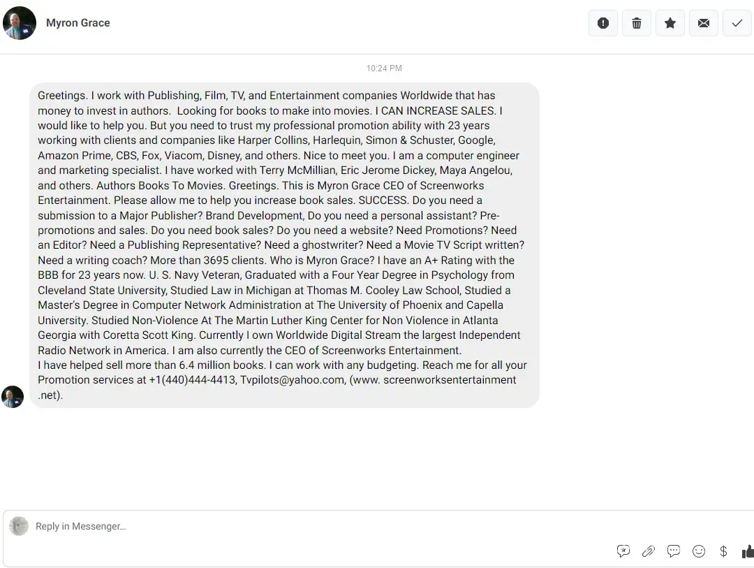 Myron Grace is an absolute scam artist. He was hired to do promotional work to promote my books and we spoke briefly about him seeking distribution for some of my television show ideas. He lied about having sold over millions of copies of books and essentially his marketing consisted of booking me on the same shell twice they had a very limited audience as well as sending email blast which were spam to people who didn’t want to receive them by copying and pasting my book description with little or no effort to introduce the contact or include photos or press releases or any of the information I provided for him. His emails and communication was riddled with typos and he even went so far as to send out a book blast with my name as the author of somebody else’s book. Things intensified when I told him I wanted to sever the agreement he became confrontational and started threatening me in my inbox on Facebook and when I blocked him on Facebook he then went to email and started threatening me. He also supposedly took some unauthorized trip that cost over $6000 and asked to be reimbursed for it. One of his last messages he even said something that indicated to me that I was absolutely right that he is completely insane and that is that he is related to the queen of England. The man is insane run like hell and do not have them promote anything for you I’m upset that I wasted $500 on his services! Here is a screenshot of the last insane message before I blocked him.