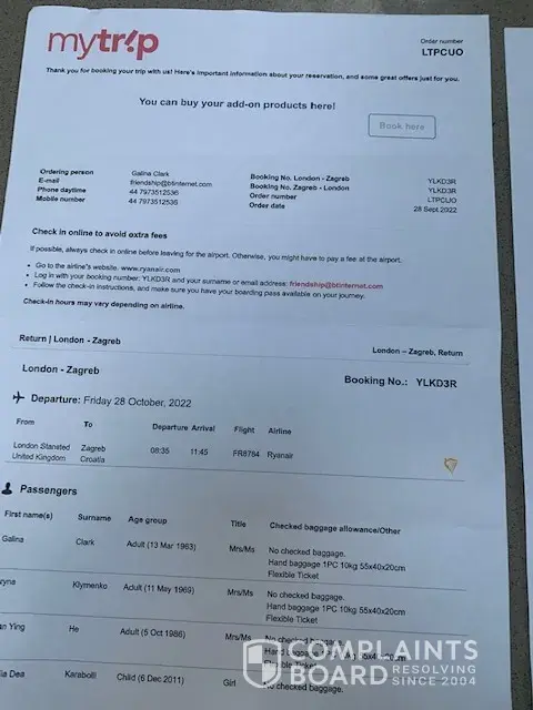 We have purchased return flight Stansted - Zagreb through My trip and add hand luggage for all 8 passengers. Paid My trip £472 for the luggage 10 kg 55x 40 x 20cm. We also paid for checking service £50.
