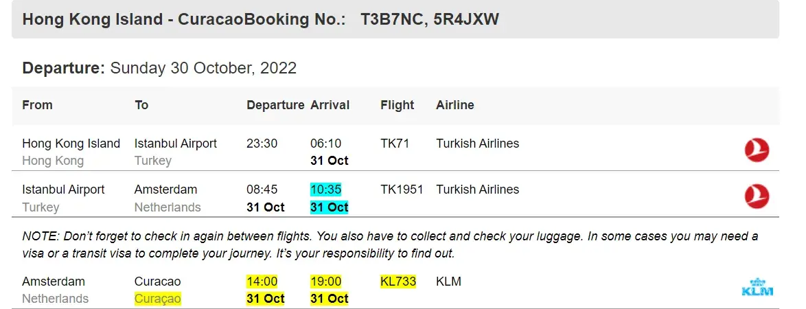 - based on the below email highlighted in yellow, the flight from AMS to CUR is 14:00 and arrival at 19:00. And the flight # is KL733. However, when I reached the gate to get the boarding pass, it was found KL733 has already been gone and it took off at 10:45. The flight took off at 14:00 is KL735. Even I rushed to Transfer desk to get a seat for KL735 but in vain. So I have to go for the booking of KL735 tomorrow and paid the change fee and tax. One big mistake is my flight from IST to AMS arrived at Schiphol at 10:35 and the flight KL733 took off at 10:45, which is only 10-minute time difference and no one can succeed in doing such connection. This itinerary is incorrect in the first place. The booking should have been KL735, not KL733., Because of this delay, I have to pay for one night at hotel too.