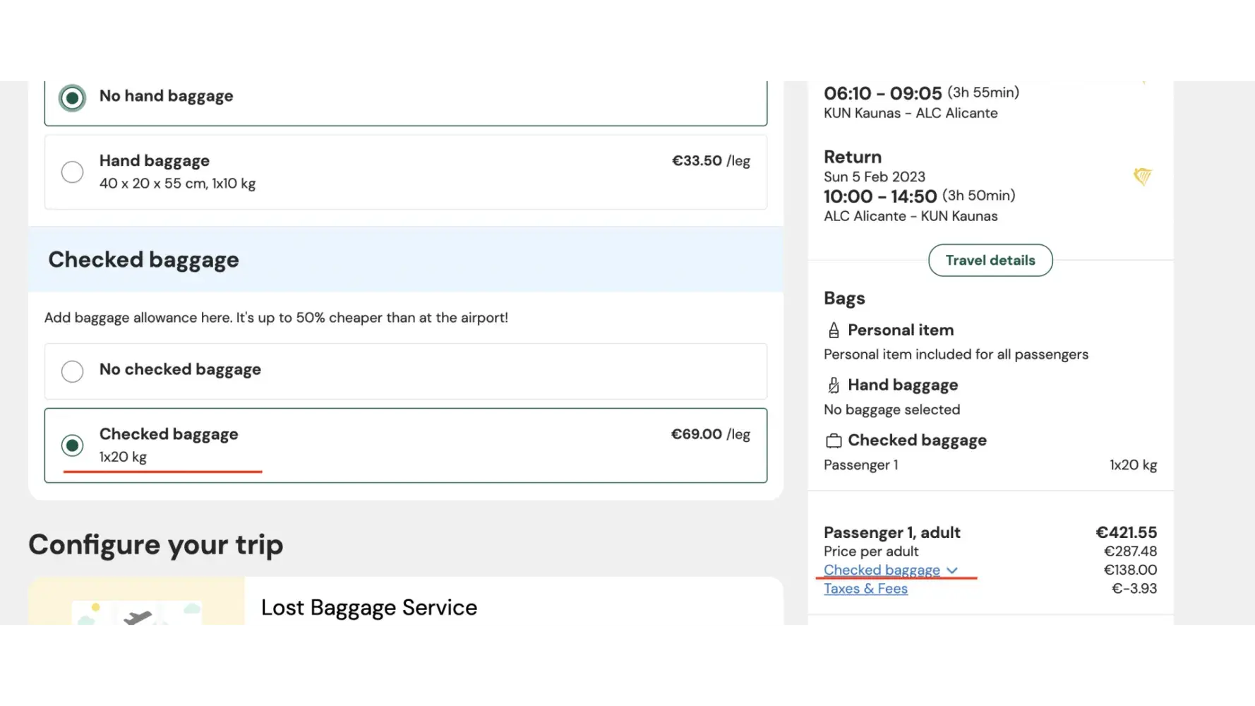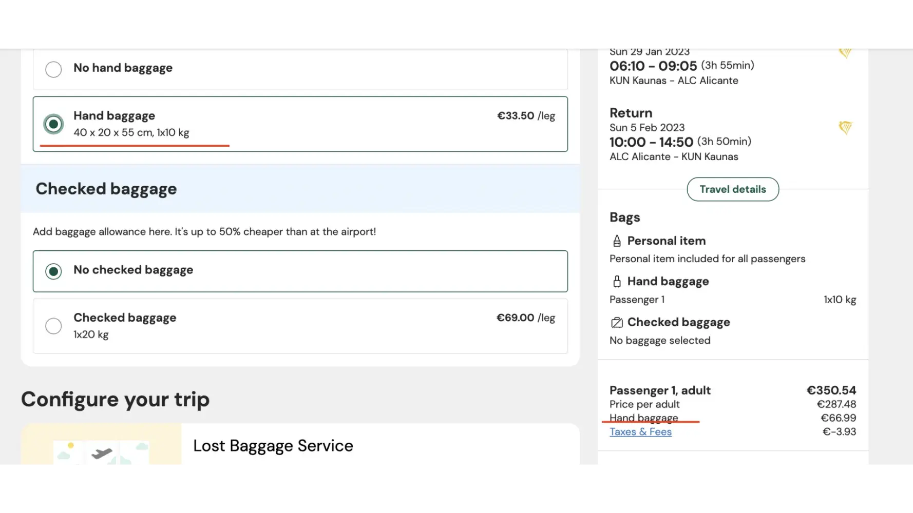 When I booked my flight, I booked ckecked baggage for 20 kg., but on order invoice it says checked only 10 kg. And the company says that I only allowed 10 hand baggage. But hand baggage is not checked first, and they say that I only booked 10 kg. hand baggage. I tryed to do booking again and did some printscreens when you try to order hand baggage and when you try to order checked baggage. You can see very well that checked is 20 kg. and hand is 10 kg. And on my invoice it says checked baggage but in other place I only allowed 10 kg.