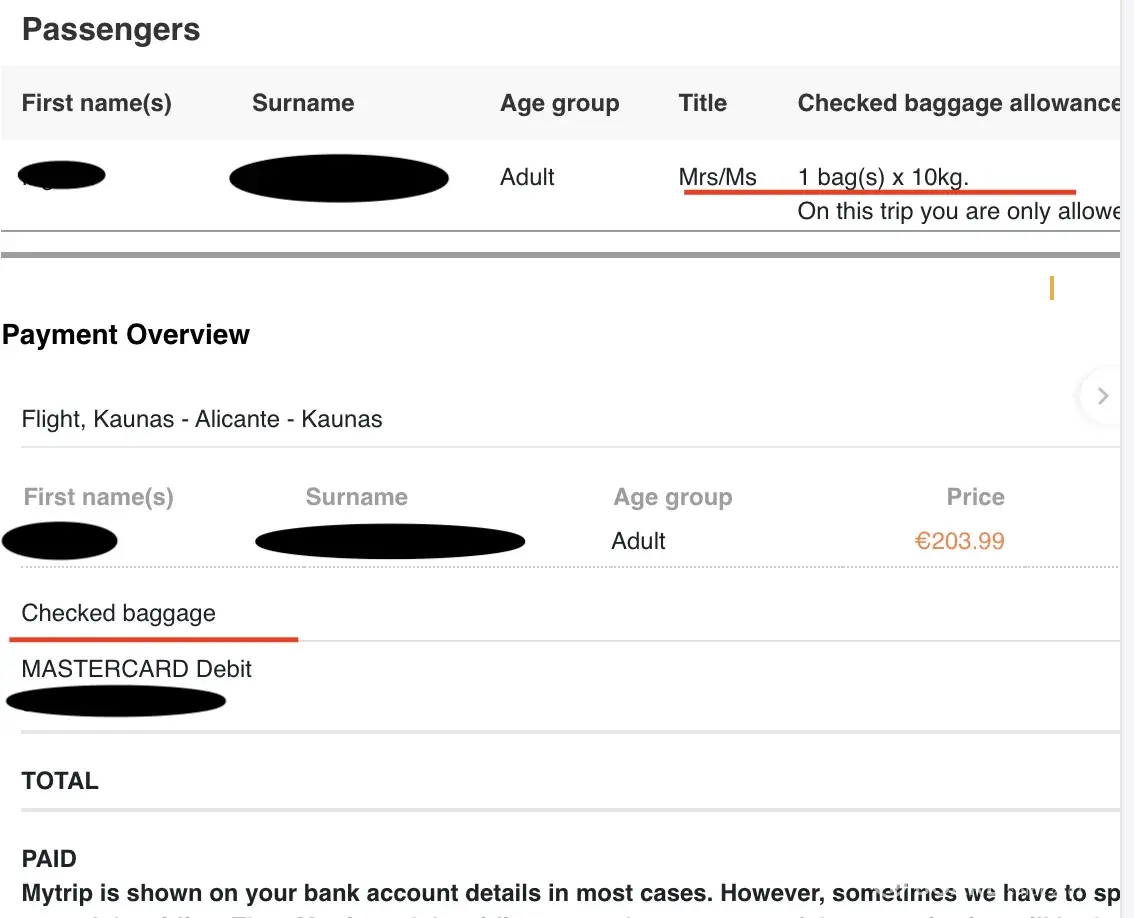 When arriving for return fight from Faro to East Midlands UK on 18.4.22 I was told at check-in desk I needed to pay for hold luggage. This had been paid to MyTrip and I had evidence of that, but was told by airline check-in staff that the money had not been paid to them by Mytrip.
