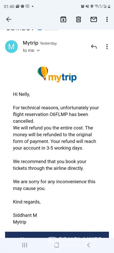 4. Mytrip didn't find any alternative to the flights once the date approached.