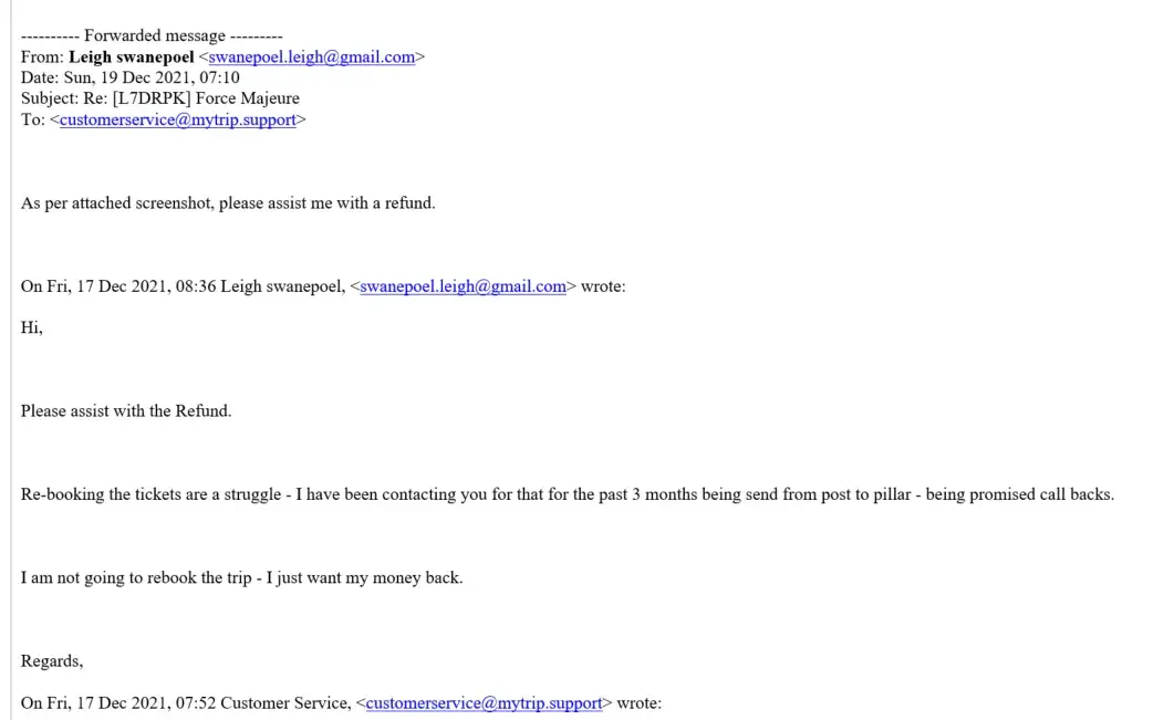 Then instead of returning my money immediately, email also states that mytrip is keeping my funds up to 5 days...why am I paying for their screw up?