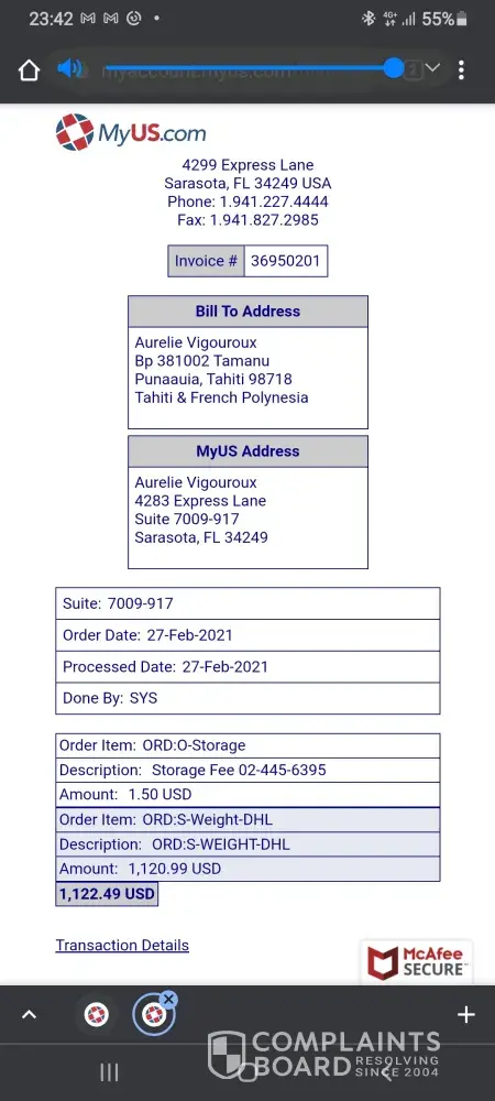 MyUS is a package forwarding service. They receive items in the US and resend to Europe. I contracted their service because I was given a replacement Bluetooth headphone-set from a manufacturer to replace a broken one. Before contracting the service, I used their shipping calculator that gave me an estimate of 33USD for FedEx Economy. See Exhibit #1. Fact...