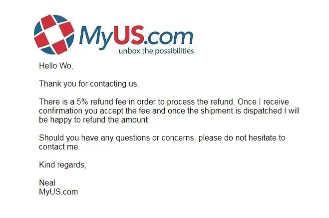 11/7/2018 - I asked myus.com to send back to sender which is Amazon, because Amazon had already refunded to me. Alas, myus again charged estimate $14.86 for return to sender fee.