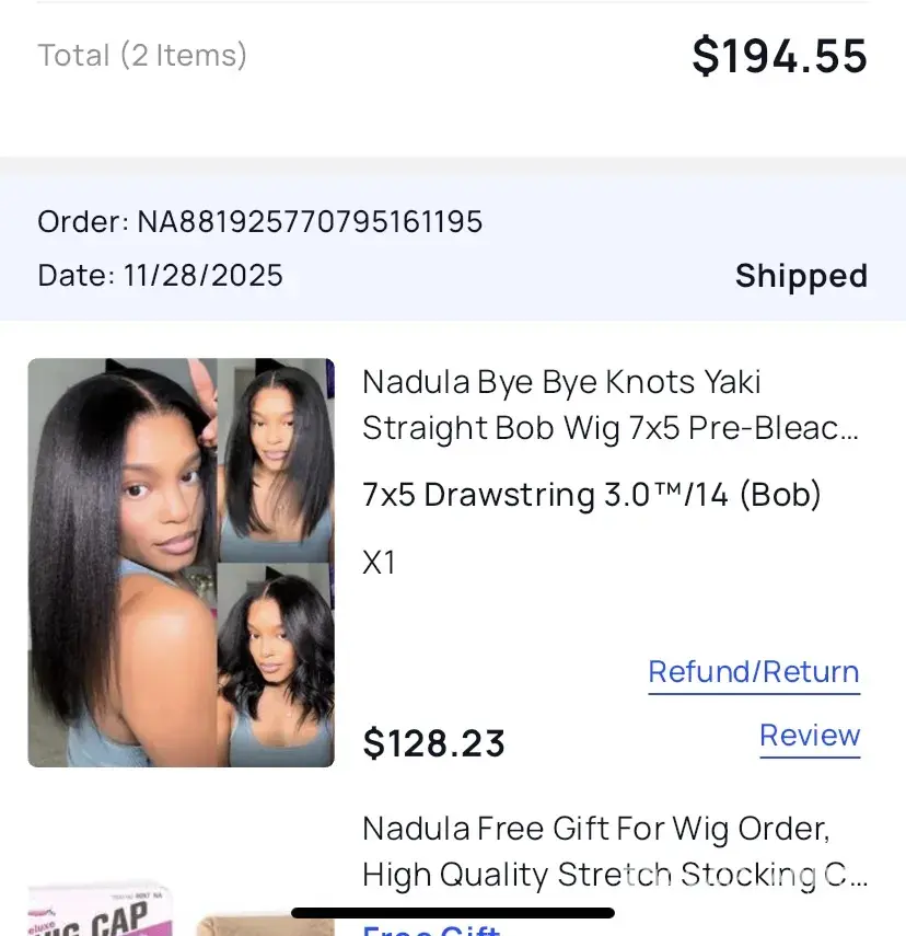 First off this company is a fraud! My first time purchasing through this company I did my research and they paid women to say these wigs and hair bundles are 100%human hair. And even reading the reviews of the wig they were getting outstanding reviews. So I decided to make my purchase on April 8th 2022 the wig arrived April 11 2022, opening the box a foul chemical smell came from the box, I pulled wig out and noticed how big the wig cap was, I knew it was not going to fit my head properly. Tried it on any way and wig was way to big the back of wig cap was by my neck area. There is no way to tighten the wig and make it fit like advertised on website. I ran my fingers through the wig, they wig she'd like crazy and the ends of the hair where already tangled. The wig looked like it was used and they sent the wig to me. This wig looks nothing like the website are what was advertised by the company. I let nadula know I needed a full refund. They stated to send the wig back. But reading the other complaints about this company not refunding people's money back is insane. I will also report this company to ftc. This company is getting away with people's hard earned money. And sending customer bogus products. This is not human hair and it's not quality work.