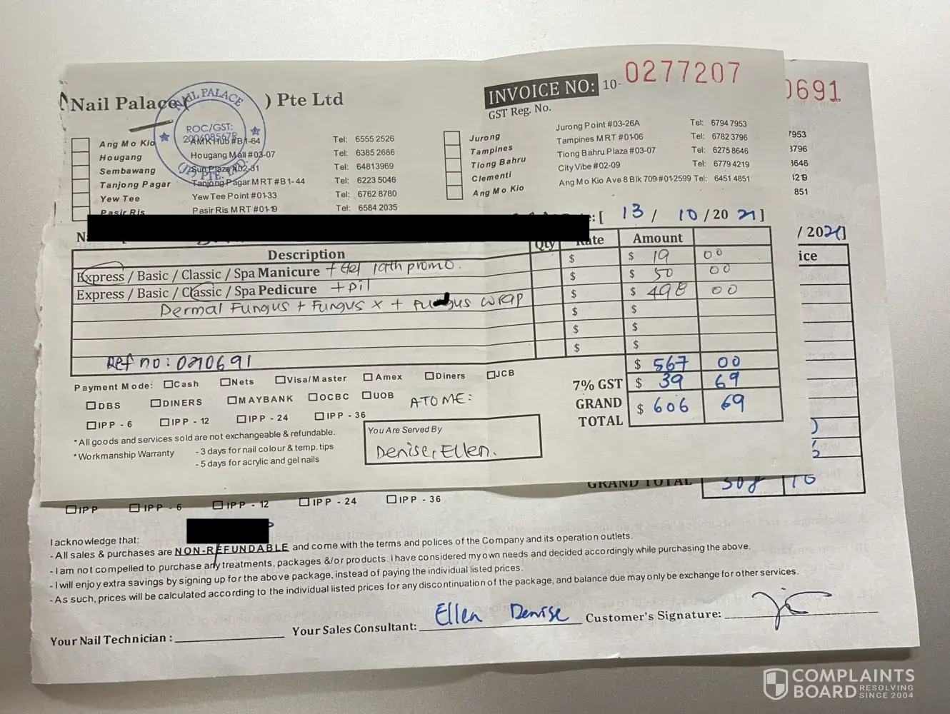 My mum is a long time customer at Nail Palace Jurong Point and has signed several packages there. We encountered unethical behavior and terrible service attitude during our last visit there. On 11 Dec 2021, we booked an appointment using her existing nail package to do a manicure, pedicure and arms and legs treatments.