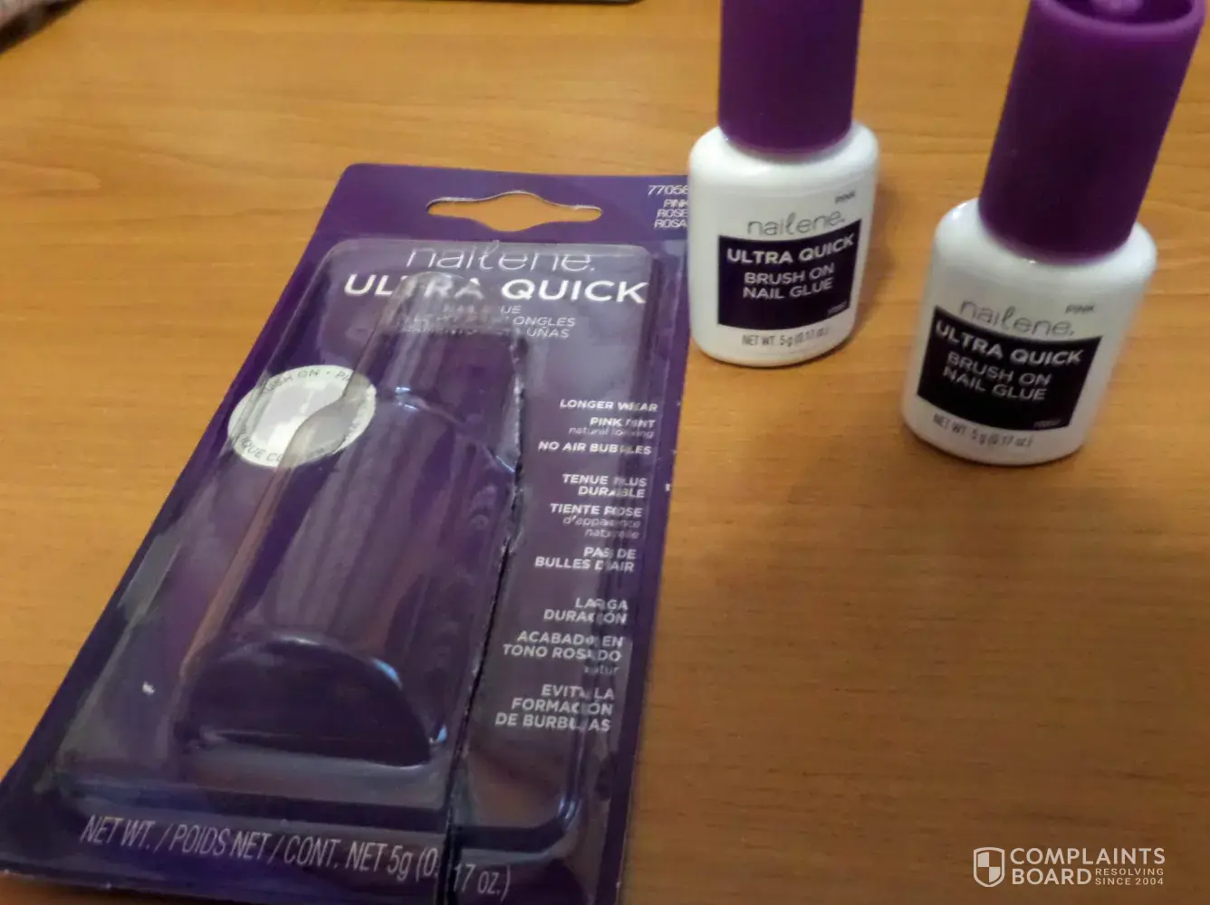 Complaint: having cracked my thumb nail, I opened a new brand new nailene ultra quick glue (pink brush on} to fix it. The top came off easily, but the glue was extremely thick, gooey & elastic stringy, not watery as it normally is, it was unusable. Fortunately, I always buy 2 packs at a time, so had a spare nailene brush on glue in the cupboard. I tried the second one. I was flabbergasted to find that this too was very coagulated & unusable. Obviously there is something wrong with the batch or your quality control.