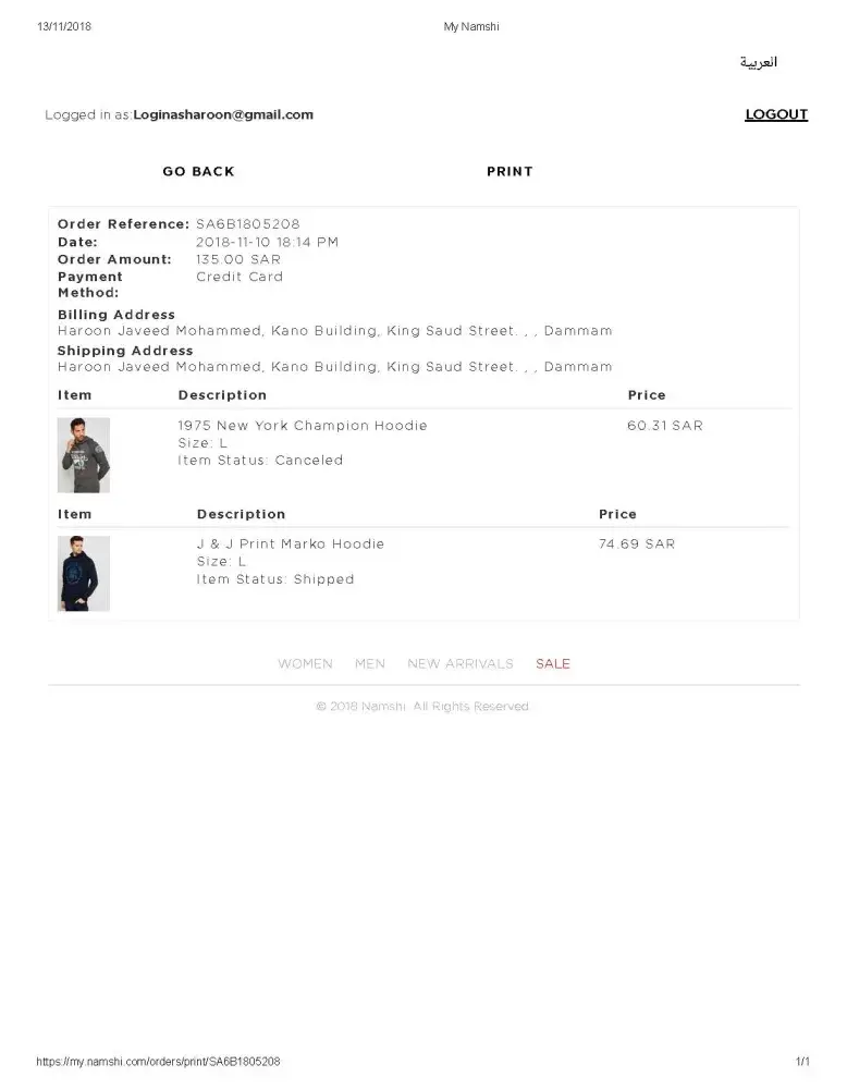 The other day NAMSHI gave a online promotion offer to buy one and get one free. I purchased two items from them and was given the promotion. Later, after 48hrs of struggling my shipment got shipped only to see one of the item was cancelled.