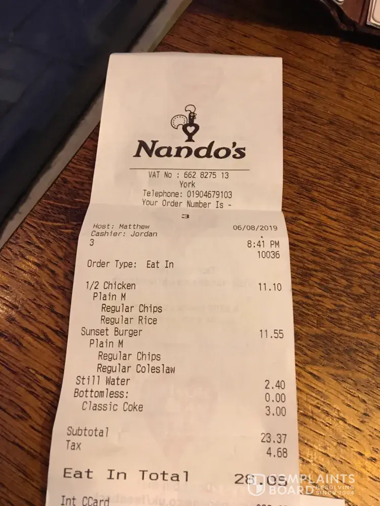 * If the receipt has changed well this is totally unacceptable as we pay the same price and the quality is not up to standards as Nandos used to be before.