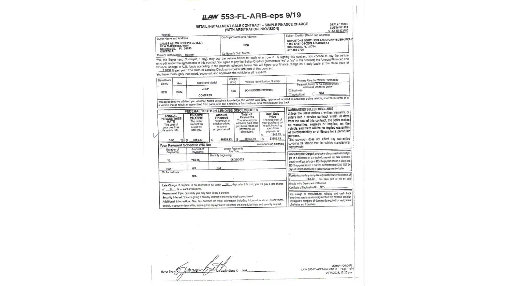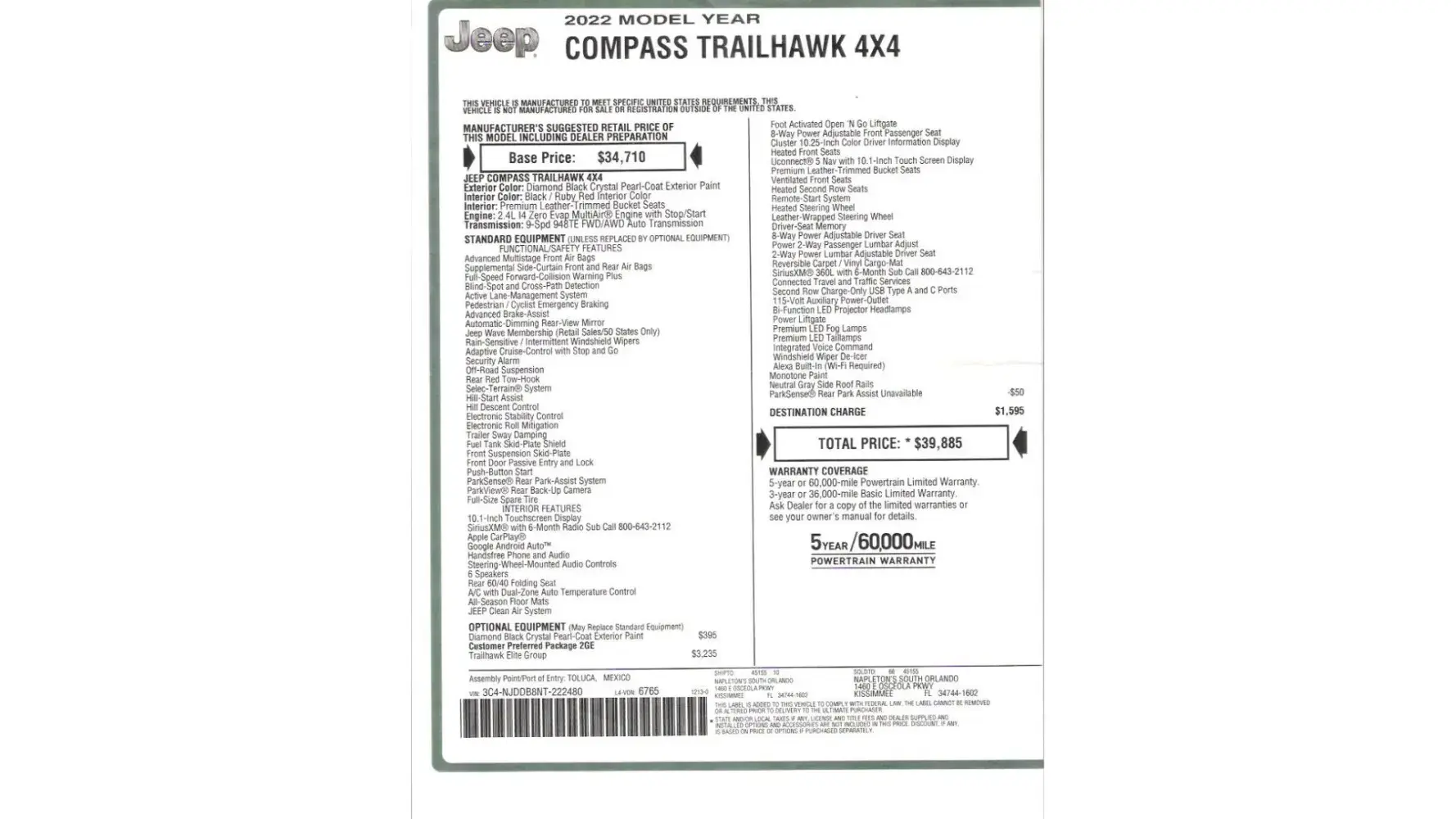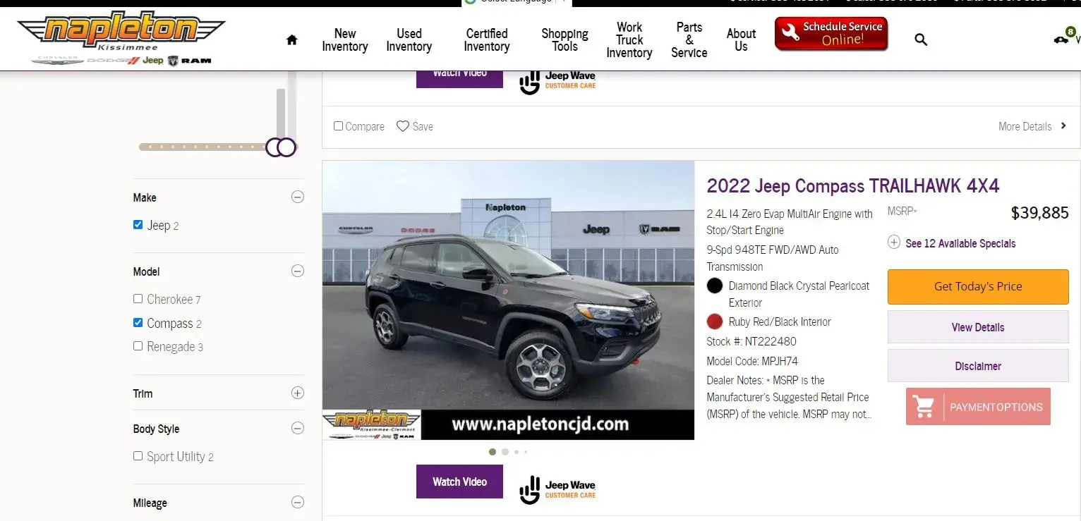 The Kissimmee Napelton dealership falsely advertised a 2022 Jeep Compass Trailhawk for $39,885 then snuck a $5000 markup into the finance contract, without informing me of this markup or going over the finance contract with me. The finance contract lists the vehicle purchase price at $44,885. The $5000 markup nor this change in vehicle price was never presented to me for my consideration on the deal. Advertised prices for '22/23 Jeep Compass Trailhawks from local dealerships on the Internet range from $33,000 to $40,000 depending on trim and options.