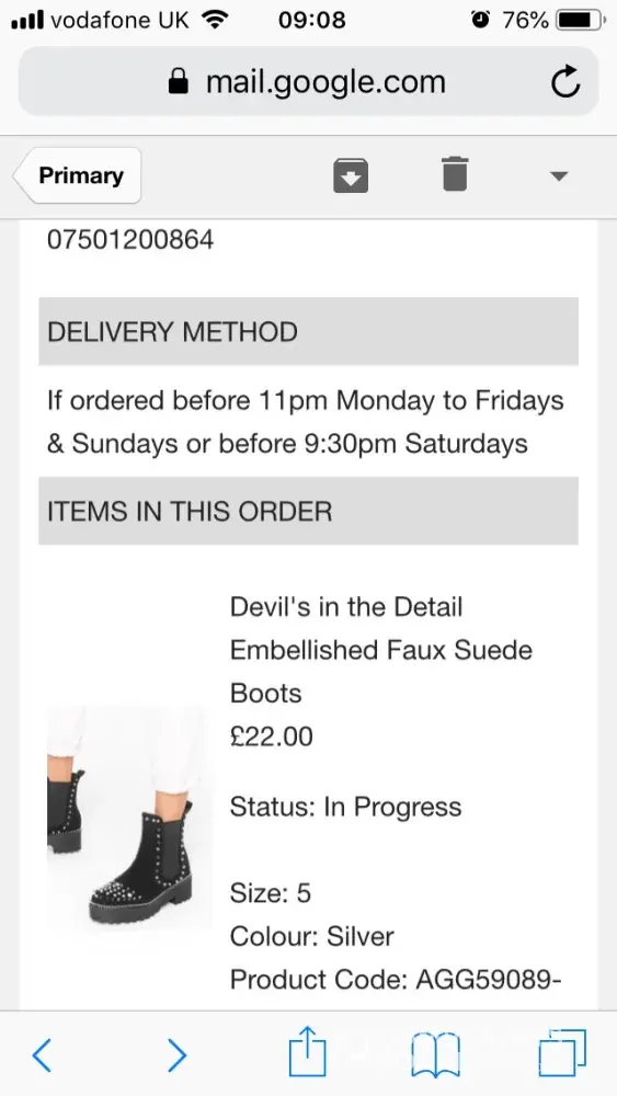 I purchased a pair of boots next day delivery on the 3rd of December at 9.10am well before cut off for next day delivery anyway they failed to deliver and said they had issues with getting orders out yet still advertising next day delivery so they were capable of sending a replacement out but did not and refused to refund. Still don't know where my parcel is or if it will ever come. Disgusting business let's put them out! And boohoo. False advertisement is illegal