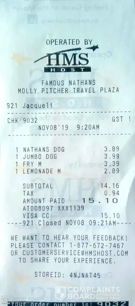 Famous Nathan's at Molly Pitcher Travel Plaza store ID 4NJNAT45 check #9032