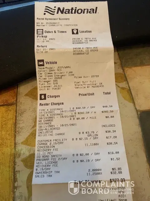 I have been a loyal customer with National, my company uses National, and I rent a car nearly every week. I am requesting closure and resolvement, as I am being held hostage for even a receipt. I will report this to my contact at the local Attorney General’s Office if this is not resolved immediately and will need to notify my corporation’s legal department.