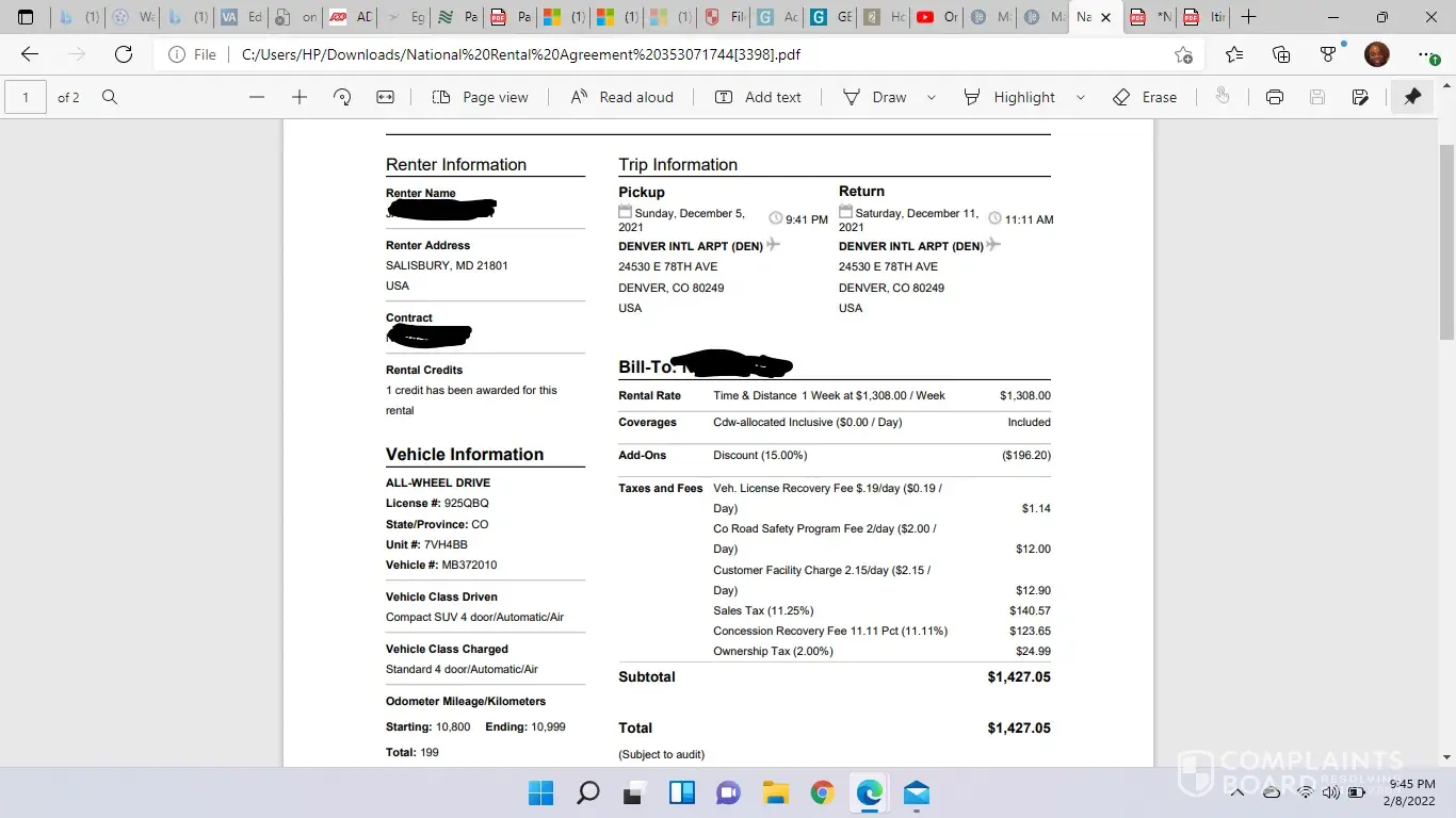 I rented a car for a week back in December my rate was $387. I was billed $1,427.05 dollars at the bottom of my bill it had this. 12/11T18:11/2021 MC (7478) next to a charge of $1,427.05, and 01/28T17:20/2022 MC (7478) with a price of -$1,039.13. Can you explain to me what these charges are for?