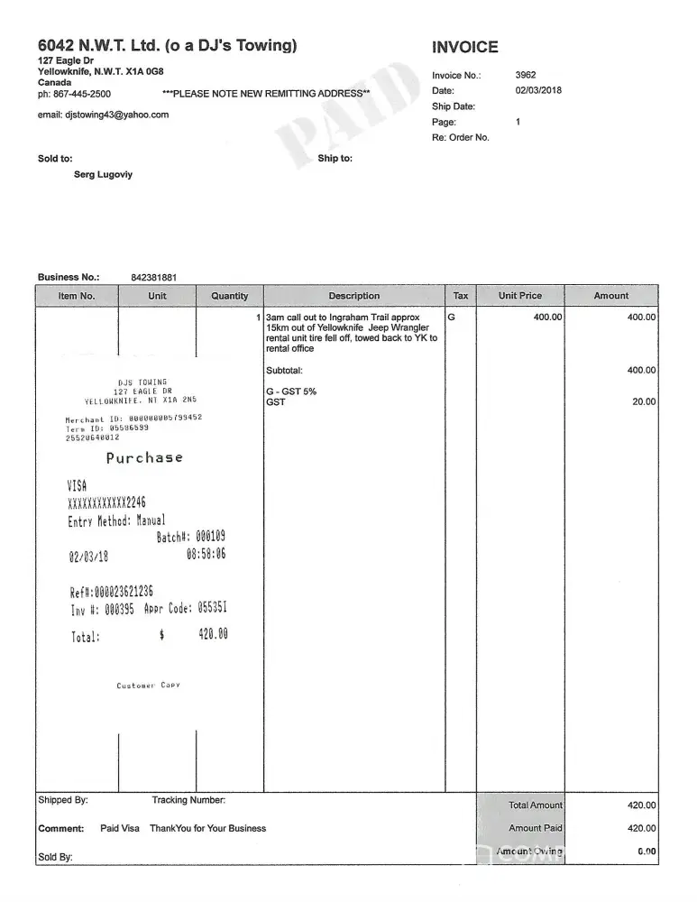 The next day I was given a replacement vehicle and the person at the counter requested me to send the towing company receipt and my credit card information by email in order to make a reimbursement (which I did the same day). It has been almost 2 month since then and I have not received any refund of towing charges. All my subsequent emails to Yellowknife office went unanswered.