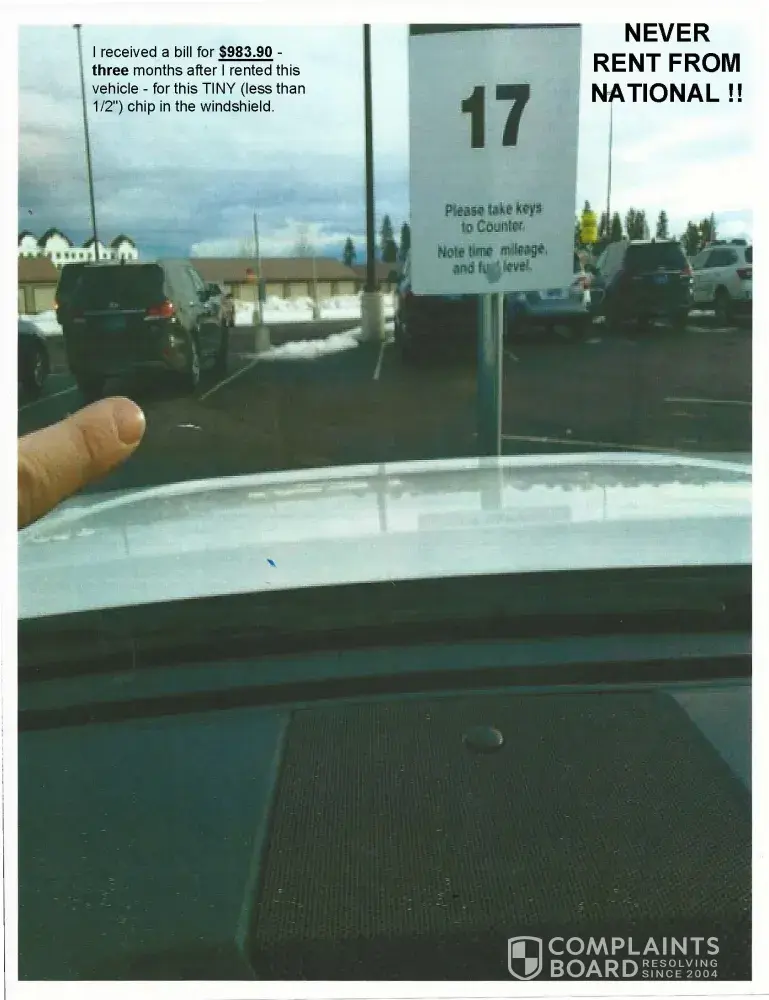 National did absolutely nothing to resolve this bogus claim. They did however, with their own documentation, prove that 1) two additional miles were driven on the vehicle after I returned it. 2) show that the rental agreement states NOTHING about replacing an entire windshield for a less than 1/2" chip. 3) show that pre-inspection and post-inspection of the vehicle was not properly done.