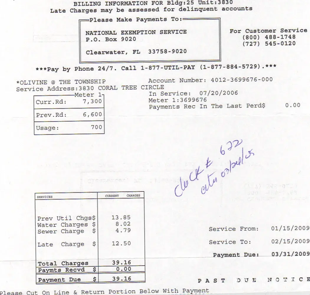 As a condo conversion complex, now we became a rental community again an this company is been charging us the water service they said every month but really we recive bills every other month with late charges por unpaid bills, at the first place we tough the mail got lost but still we have to be calling asking for bills to pay on time, the claim was send over the mail, but the late charges are almost the same amount of the bill ex ample; previous utility charges $ 13.85