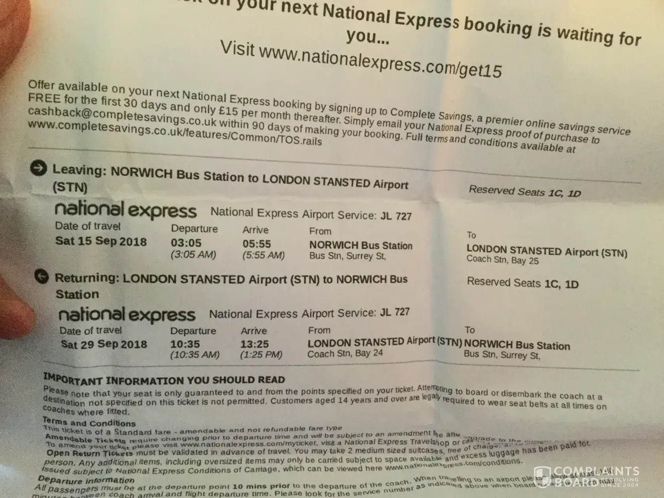 Our journey involved one change at Victoria Coach Station. Having arrived over 2 hrs late we then queued up for the first available coach to Stansted Airport. We were then refused places on this coach as we were told all the seats were taken. We then had to queue yet again for a coach which eventually arrived at 03.00hrs.