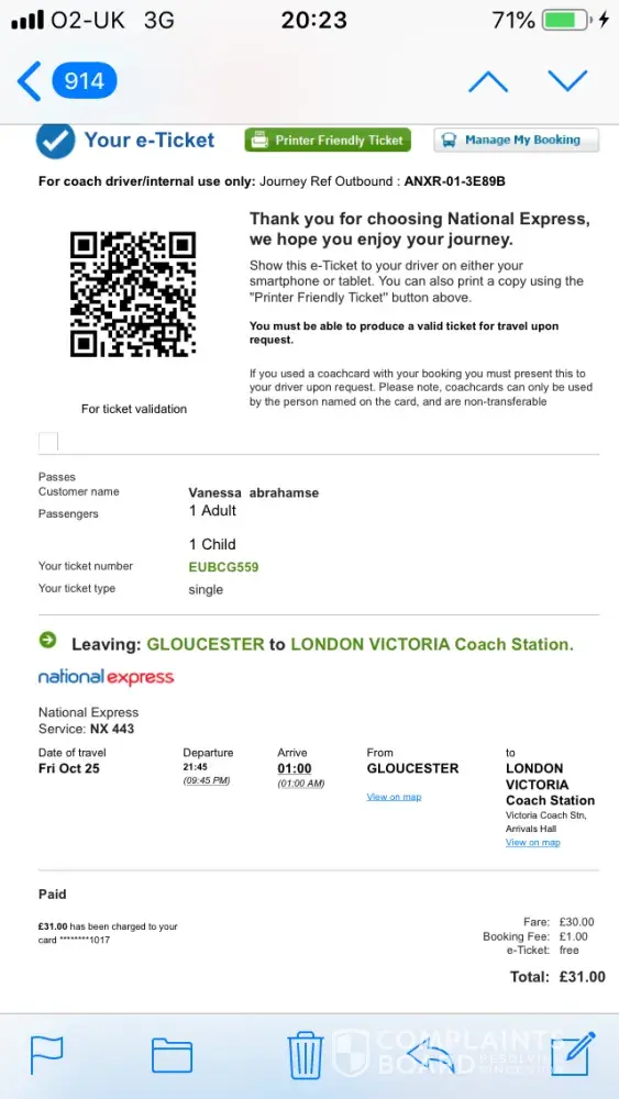 Bus left early and when they sent an email it was from a random email so it went to my junk. I had to pay for an Uber £80!