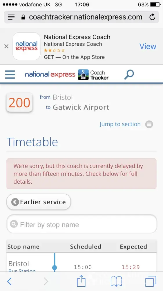 Someone tweeted and was advise that the bus had been delayed and was at Victoria station, driver was in his break. When I approached the National Express gentleman and told him what had been tweeted he said that the operations people hadn't advised him of this fact.