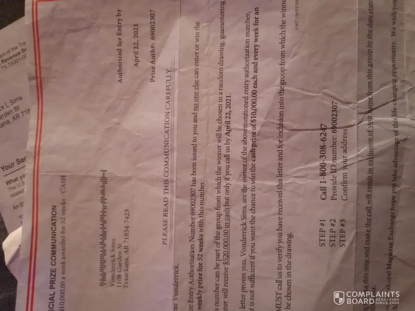 I received a letter from my mail from official prize communication on the 11/29/2022 stating that I should enter a number which is [protected] on December 15, 2022 to win the $10,000.00 weekly for 52 weeks with this number and said to call this number which is [protected] in order to win the prize and said they at national magazine exchange and it said sincerely from E. Wright.