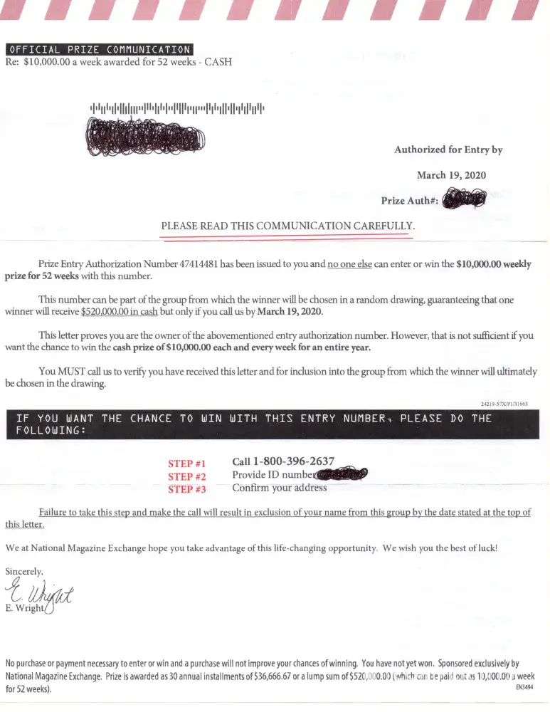 When my sister told me that she won my first thought was she got scammed. I thought ya right they just gave you a check for $45, 000.00 dollars for nothing at all. I looked on the internet read all the bad comments that people had to say about National Magazine Exchange. So many bad comments I believed it more to be a scam. My sister did not think she got scammed her house is full of magazines she loves magazines she said she entered the contest online all the time. My attitude was whatever. About a week later she call me crying everybody she talked to told her it was all a scam. My mom and I went to the bank with her to prove it right or wrong for once. THE BANK TOOK ONE LOOK AT IT FIRST THOUGHT SCAM. BUT THEY CASHED THE CHECK AND GAVE HER THE $45, 000.00 after verifying the check with the company. It amazes me that a company can be so generous to its customers and then for people to talk so badly about them. I try to enter everyday and I suggest if your lucky enough to receive a letter from them you have a chance to STRIKE IT RICH don't be scammed by all the comments on the internet that are telling you its no good. You believing it's a scam only increases there chance of winning.