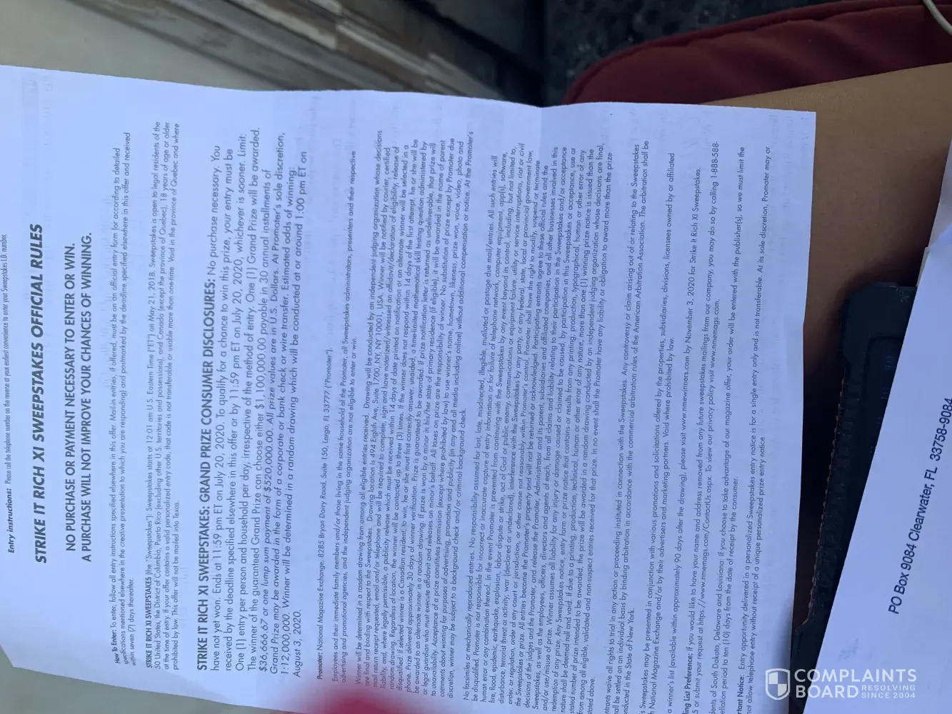 First I got a $1, 100, 000.00 letter saying I had to call to register within 10 days, by 10/10/2013. The grey fine print details on the back in 4 pt type were illegible. I was offered a pair of quartz watches and My choice of 3 magazines to enjoy for $1.29 a month. All they wanted was My credit card #. Having a Current Visa/MC card is a prerequisite for entering their sweepstakes.