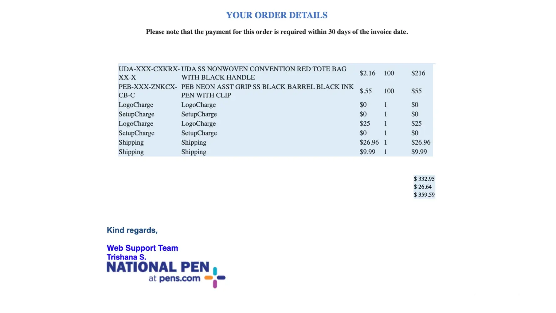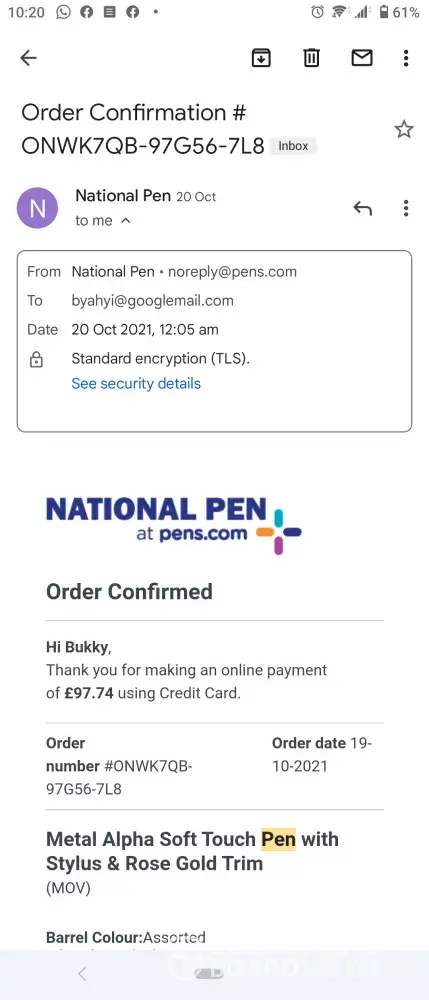 I was billed for order and returned my payment immediately. After giving pens out to customers and potential customers I have been told by many they are no good . After using a couple of times they quit writing.