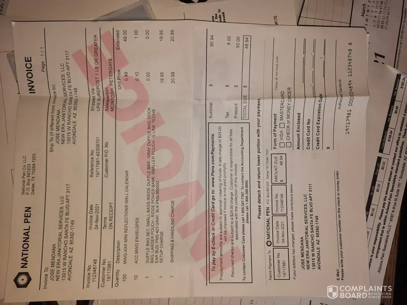 Purchased a promotional sale Mini Wall Calendars which included a free gift. Received the purchased items, however an additional charge was included for the free gift item a duffle bag. National Pen in the past some of its employees have claimed extra customs charges stating their based in Jamaica so us the consumer needs to pay import and customs fees.