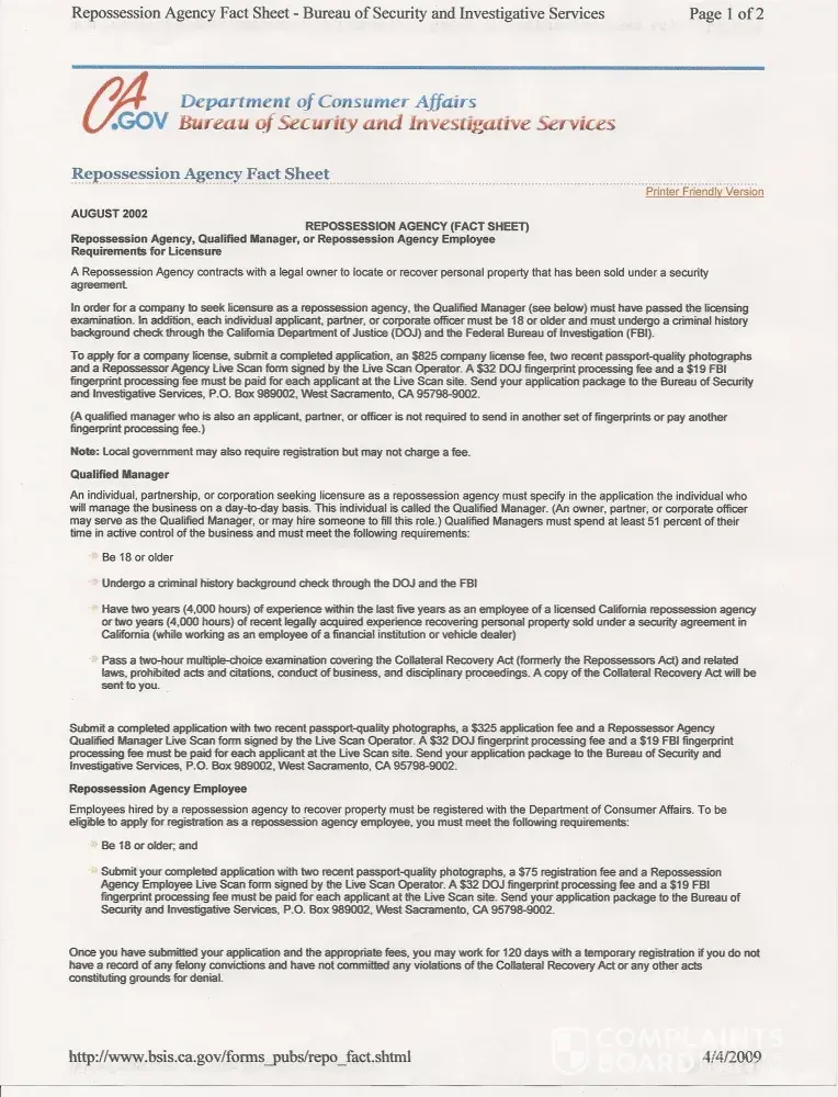 this company is a forwarding company ie. they dont do any repossession despite what they claim and advertise. the "base fee" they quote to you is a made up number and they attempt to protect themselves and cover up thier intentions to defraud the customer by stating is the base fee and then dependant upon the degree of difficutly. - Once they recieve your "agreement" they do some basic skiptracing and then hire a local repossession agent to recover the vehicle, they then charge thier base fee plus additional fees for background investigation, skip tracing, doc fees etc (most of which is not actually a service that you recieve or that is even done on the case just a line on the invoice) and the repossession agents fee at a mark up. the $800 dollar base fee quickly becomes a couple thousand dollar charge. it is intentional deception / misleading practices and just short of, if not, fraud. the owner of this company not only rips off his customers he also has no qualms to steal form his clients or employees.