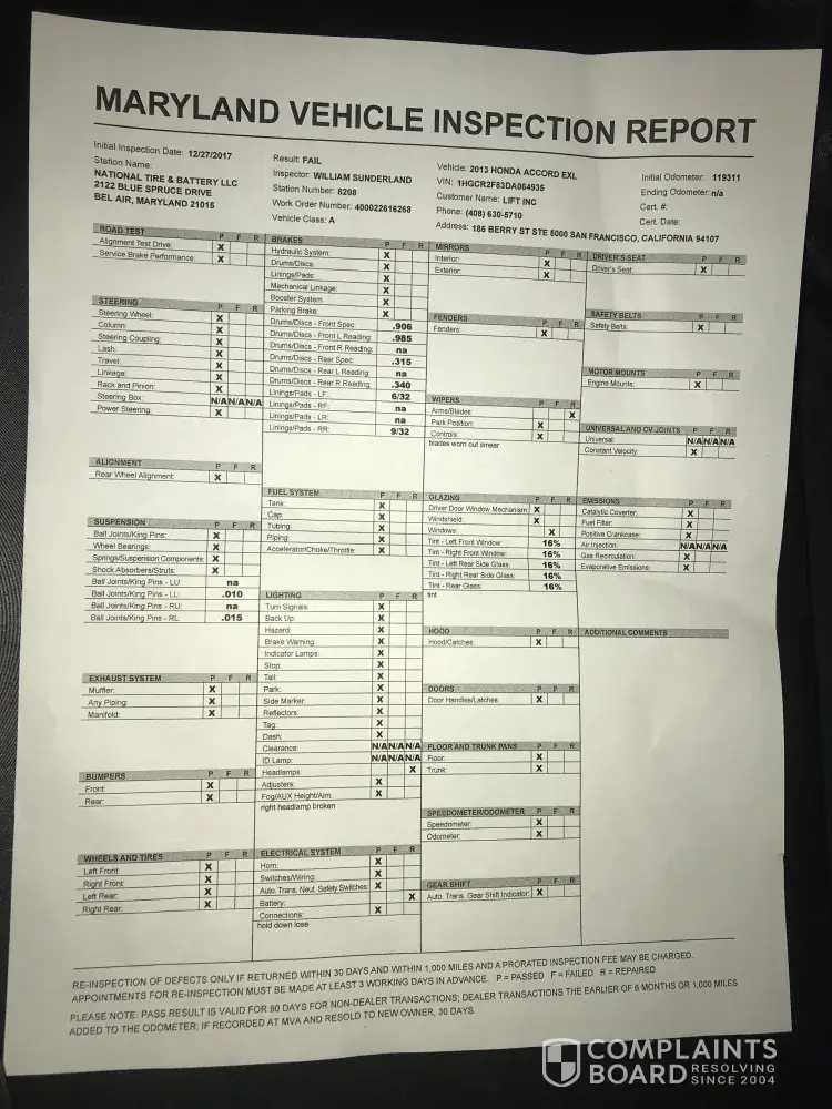 On 12/27/2017 I went to the bel air, MD location to get an inspection i waited 2 hours after scheduling an appointment and being on time watching people come in after me and leave before me to be told I failed my initial inspection I was told the only thing I needed to get done was tighten my battery hold, I needed a new head lamp, and new windshield wiper blades i was told multiple time even though my tints didn't pass Lyft doesn't care about tints on 1/6/2017 I got everything fixed on my vehicle and called and asked could I come get my vehicle re inspection as I live (a hour away )I drove back to the bel air, MD location and once I got there was told that I can't get my vehicle can't get re inspection because the same initial inspector wasn't there even though there was another inspector on site after being completely frustrated I asked when will he be there he said Monday 1/8/2017 At 8am I got there today at 8:20am to be told that inspector was not In at this point I didn't want to hear that the same front desk person remembered me and knew I was mad he then called the inspector to ask can he check off what I got fixed and he send a new paper via for him to give me in which he did after driving a hour back home I'm submitting my inspection form to Lyft saying they are not accepting it because it says failed at the top I called bel air, MD location and said Lyft is not accepting I told them but I was told by you that my tints don't matter for a Lyft inspection the guy then told me well about 15 Lyft drivers told them that it's not an actual fact if I would have known that I needed to remove my tints in order to pass my inspection I would have done so, so that I didn't drive a hour away for the third time just to be told I didn't pass inspection I told the front desk clerk you shouldn't tell customer that they don't have to remove tints for Lyft in order to pass inspection unless it came from Lyft the company not rumors they are hearing from other drivers I am so upset with this company completely unprofessional I don't see how and employee would tell me one thing going off a rumor and not an actual fact from Lyft the company it's self this is beyond ridiculous and not good customer service I would like to speak to someone about this issue as this company has completely wasted my time [protected]
