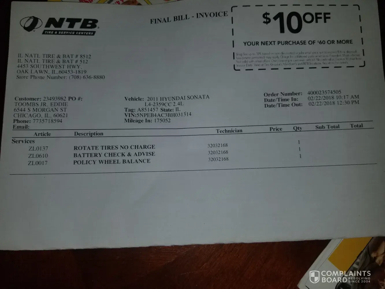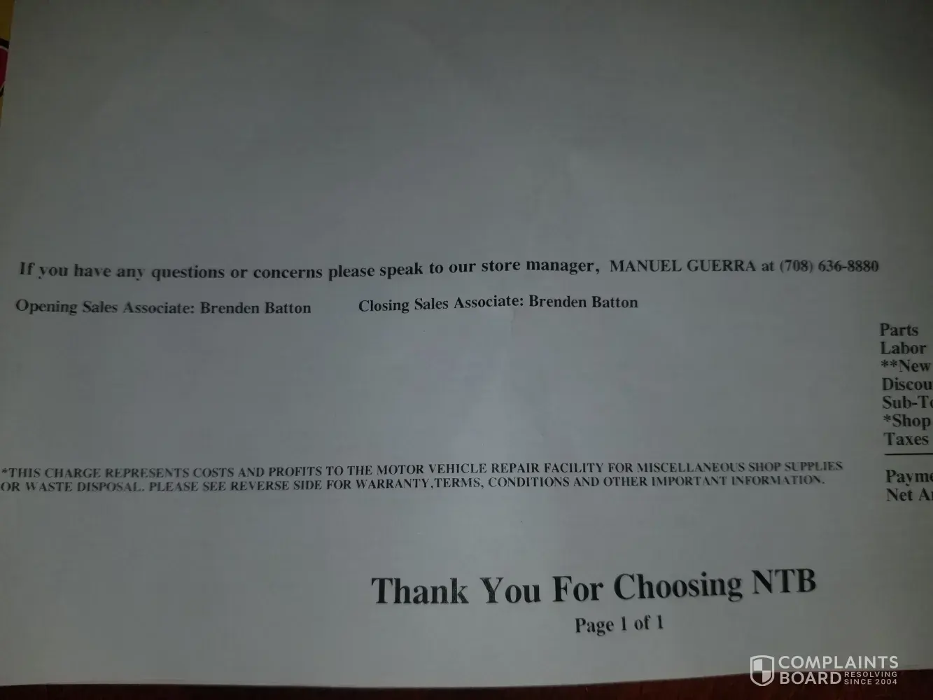 Back to NTB, and when I get there I see my car in the service bay. When I walk in the door, the sales associate says that my car is almost done it just needs an alignment, should be about 20 minutes. Let finish the paperwork, NOW we go back to the original prepaid paperwork from the beginning of this ordeal, it has the special number on it that will link the prepayment with the service done.