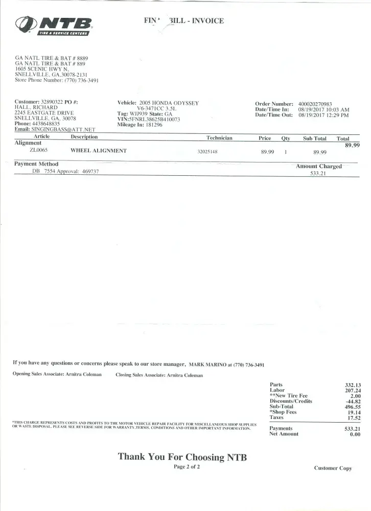 Incident Date: 08/19/2017, Client Number: # [protected]. On this date I took my vehicle to NTB because I could feel a slight shaking in the steering at highway speed. Upon my arrival a service manager looked at my two front tires, and showed me how the drivers-side front tire, was wearing unevenly. I agreed to purchase two new front tires, a wheel alignment, a new battery, and terminal, a rear windshield wiper. From our conversation the two front tires were supposed to be replaced, instead they put the new tires on the rear, for some reason, as I discovered the next day upon return to NTB. The reason I brought my car back, was because it shaking worst now, than it was before I had it serviced. Upon my return I was informed that my vehicle could not be properly aligned, until I had some additional repair work done. I believe it was bent tie rods, and a busted something that contains a lubricant of some type, was all over my transmission pan, as the tech described it to me. Why was I not informed about these conditions prior to putting new tires on my car, only to be damaged the same way the old tires were? I feel for NTB to make it right with me, they have two options. One, refund to me $286.65 tires. that will cover the tires, the tire protection, and the wheel alignment; or option two, repair the above noted needed repair with free labor, I will supply the parts from the dealership, and also give me the Tire Protection Free. This is an especially hard time for me to be dealing with financial hardship, since I am going to closing on my new house on 10/19/2017. I got a veterans discount. I hope this is not how NTB thanks our nations heroes for their service to our country. Do the right thing. I really don't want to start a letter writing campaign against NTB, but I will. However, I feel every on e deserves a chance to correct a wrong.