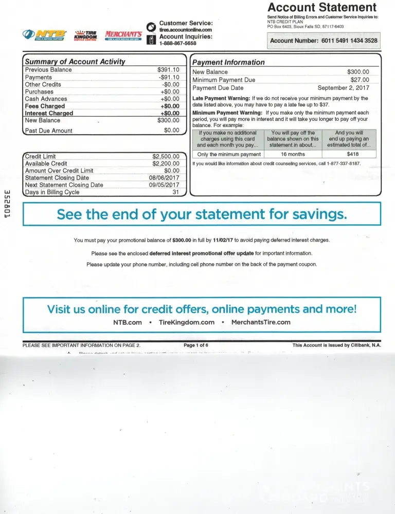 We chose this place because of buy 3 get one free advertised special. Purchased the alignment package and road hazard on all 4 tires. Total cost was appx. 880.00. It took over a week to get the tires mounted on vehicle ( complete staff came down with the flu) is what I was informed by NTB corp.About a yr and a half, my husband ran over a piece of concrete on the freeway, returned to have very new tire replaced, was offered 50 dollars off a new tire . This is ridiculous. I will never return