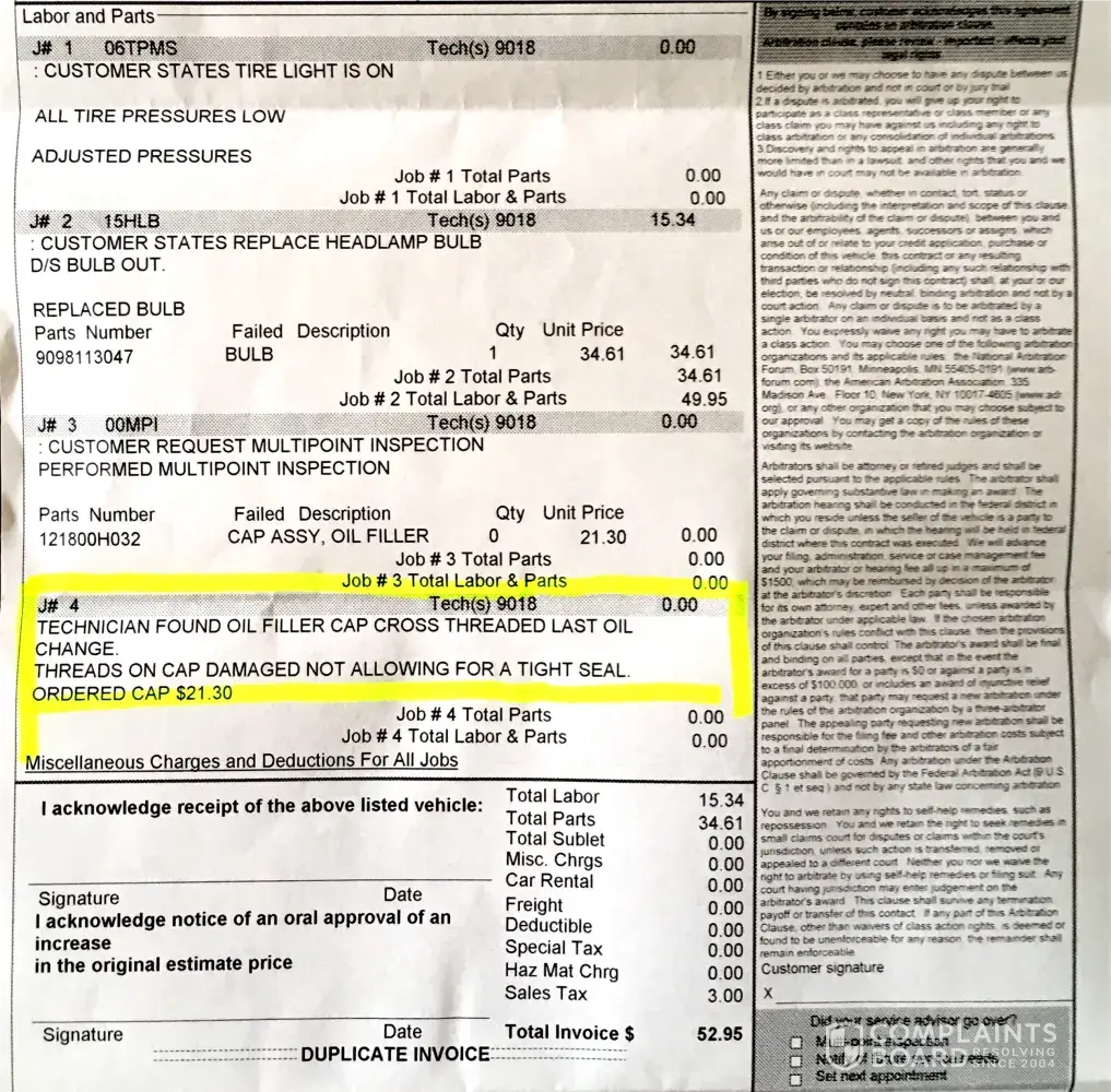 I went to the NTB in Greensboro, NC on 8/21/2017 and had an oil change service. Today, 9/11/2017, I went to a Toyota dealer for a different service and was told that the oil filter cap was damaged, which was most likely from the last oil change.