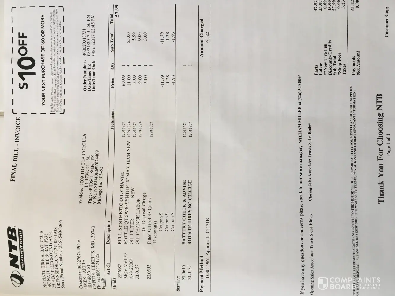 3. Decided to bring my car to the Beaumont location since I was visiting my family. They had to order two brand new TPMS sensor from the dealership, which caused me to drive back from Houston to Beaumont, TX which is an hour away, to have them install and rebalanced my tires because of the vibration. Which was no better still had a lot of vibration, at this point I was done with NTB never going back. If I had to recommend, please bring your car to Modica Bros. Excellent customer assistance and professionalism. Brought my car to them and everything was correctly done. They saw that tire balance was incorrectly balanced and wheel mounts were coming off. I called, customer service they sent me a $25 gift check it's going to cost me over $300 to get my wheels repaired, PLEASE SAVE YOURSELF THE TROUBLE AND GO SOMEWHERE ELSE.