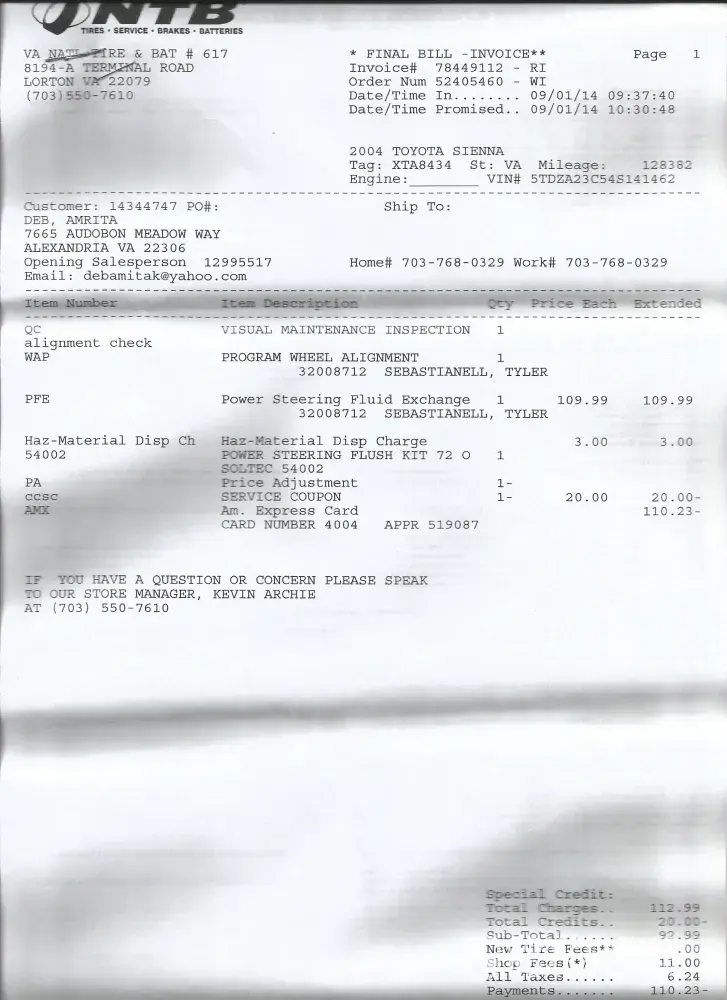 The next day (on 1st sep, 2014) I have visited another ntb store (8194-a terminal road, lorton-22079,