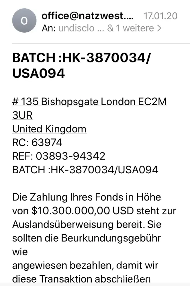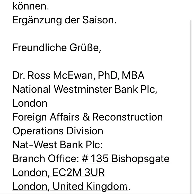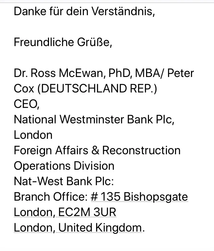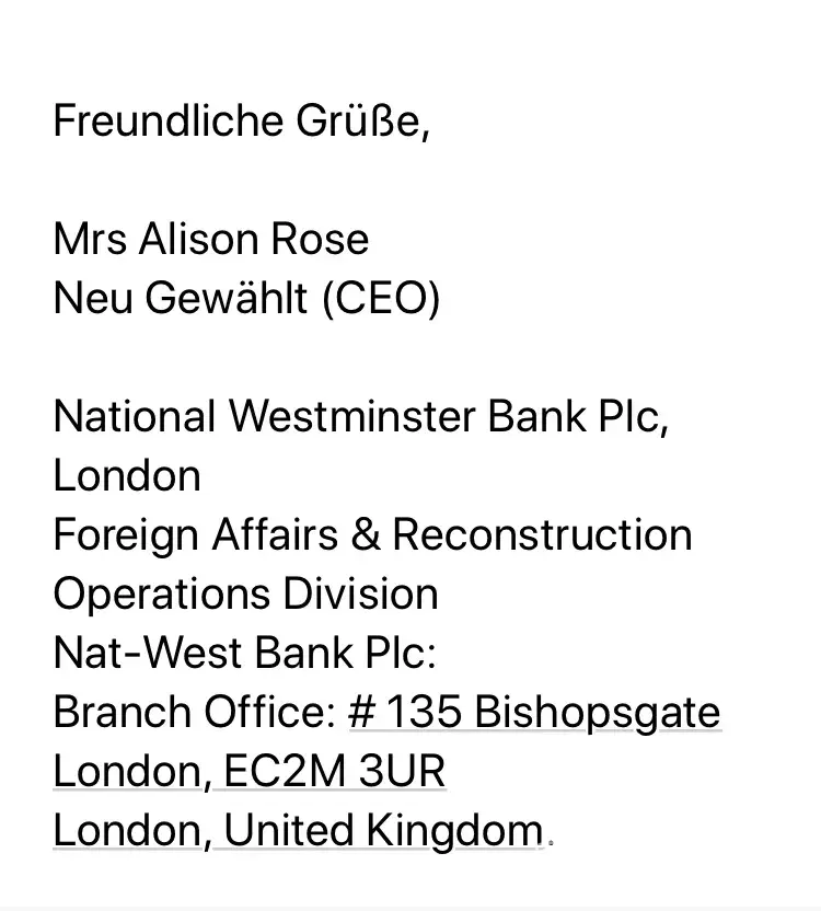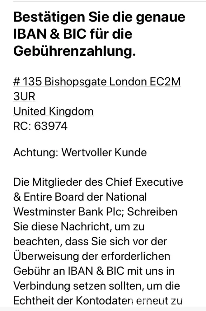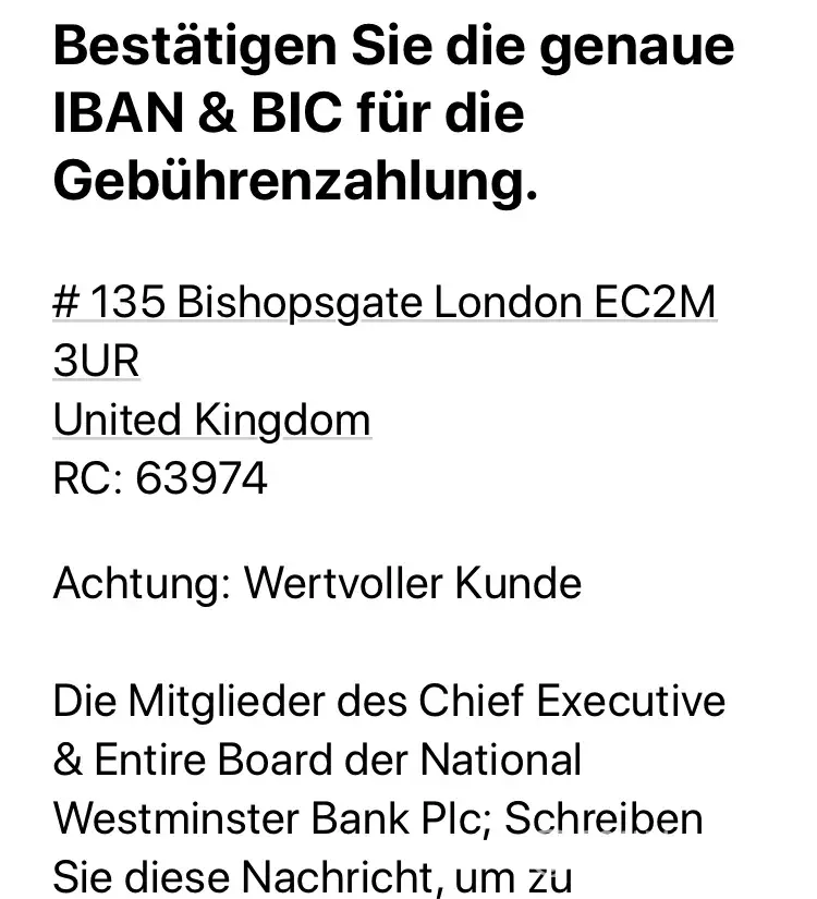 Ich würde gerne wissen, ob diese Nachrichten von Ihrem Institut kommen und ob die Nat -West Bank das Anwaltsbüro tatsächlich damit beauftragt hat, mich zu kontaktieren .